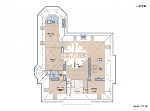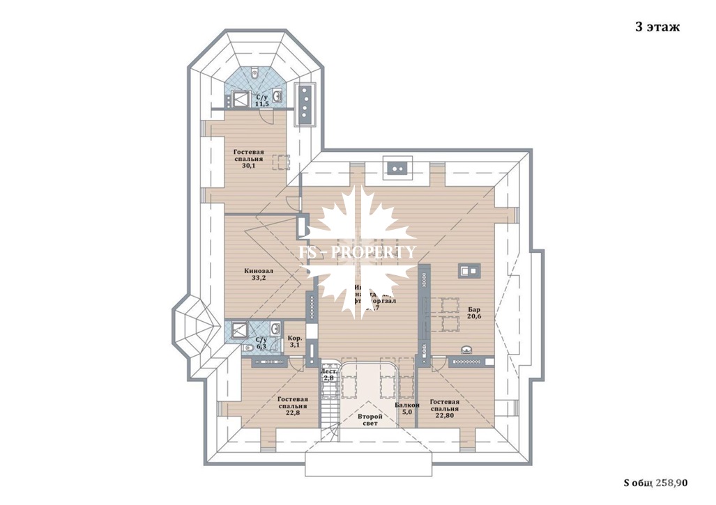 Мансардный этаж: 3 гостевых спальни, 2 гостевых санузла, кинозал, хобби-комната с выходом на балкон, бар.