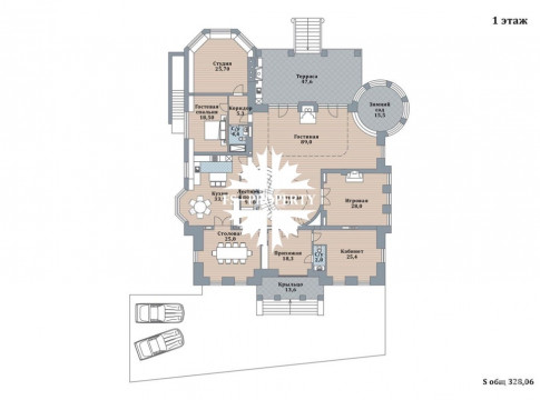 1 этаж: большая гостиная, кухня, столовая, кабинет, игровая комната гостевая спальня, 2 гостевых санузла.