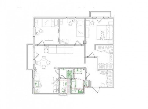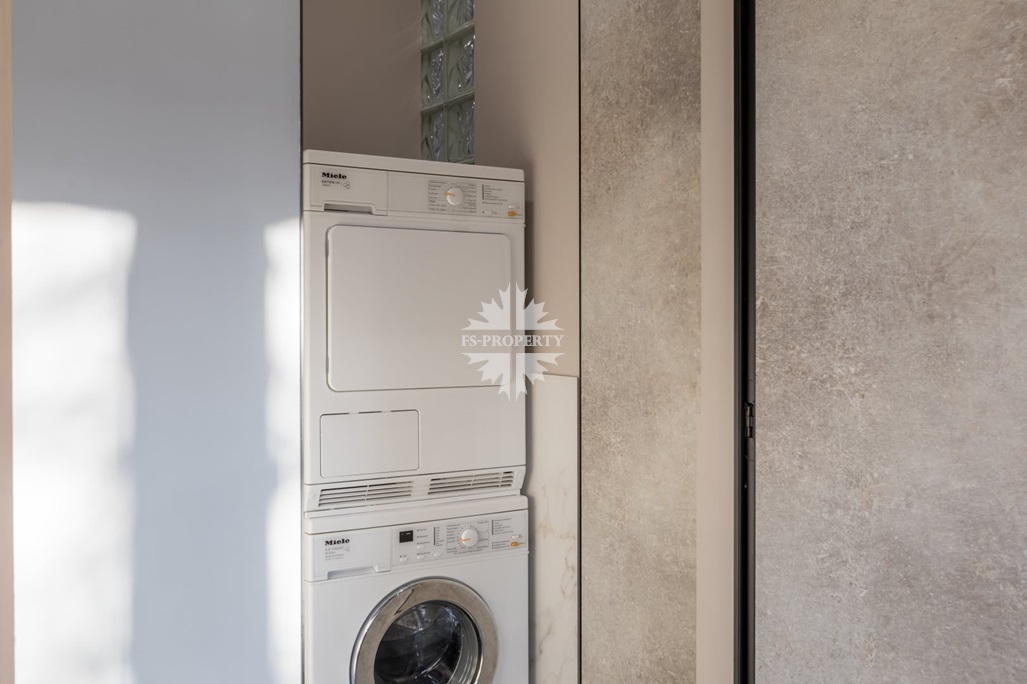 Функциональная и грамотная планировка: кухня-столовая, гостиная, спальня со своей гардеробной, 2 детские спальни, 2 санузла (с ванной и душевой), постирочная, прихожая, 2 балкона.