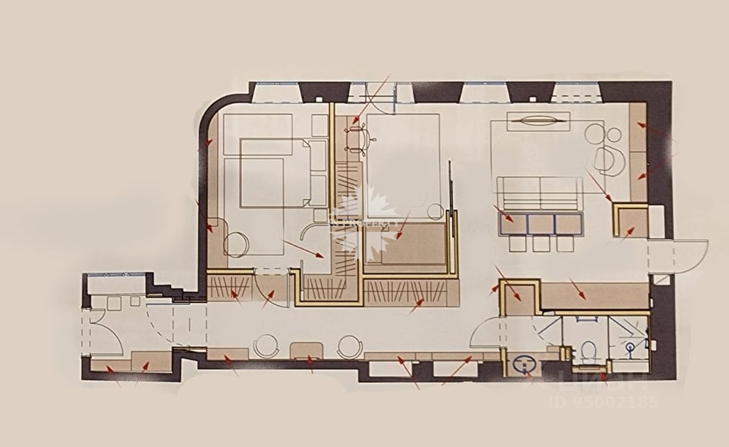 Функциональная и очень удобная планировка: кухня-гостиная, спальня с вместительной гардеробной, спальня-кабинет, большой санузел, постирочная.