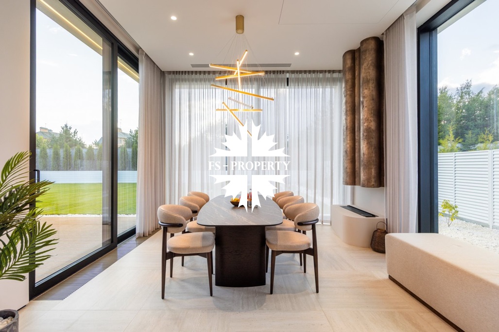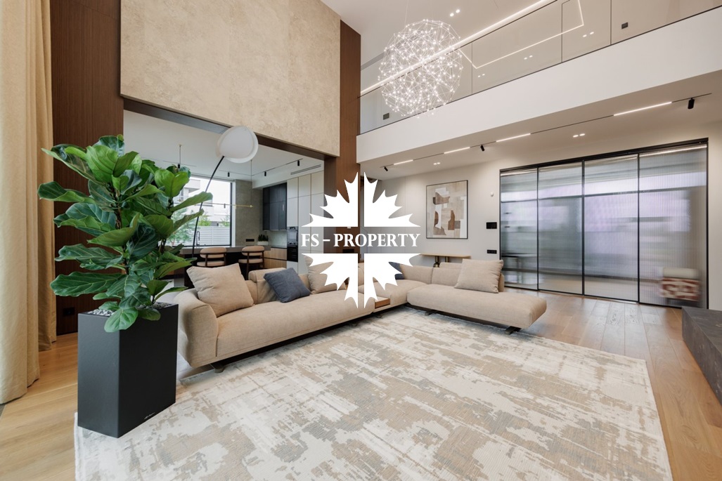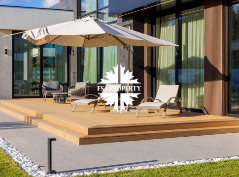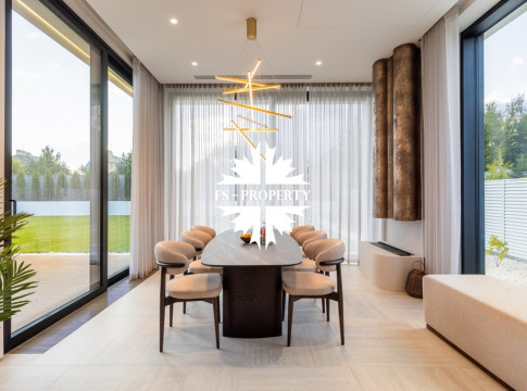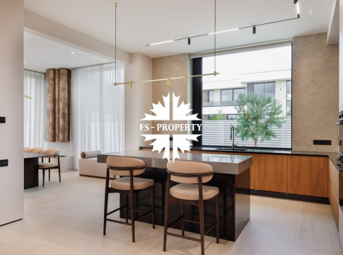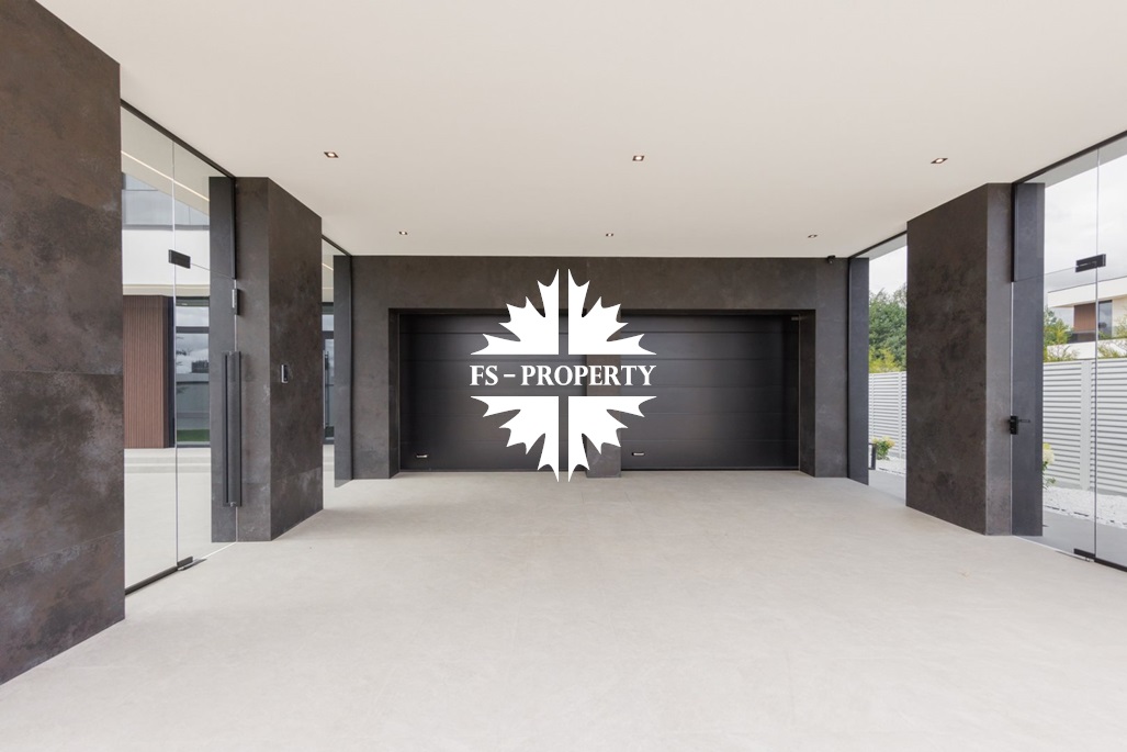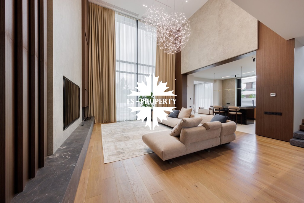 1 этаж (285м): гардероб при входе, кухня, просторная гостиная со вторым светом, столовая с панорамным остеклением, гостевая спальня с собственным санузлом и гардеробной, бойлерная с отдельным входом для обслуживания, гараж и навес на 2 автомобиля, просторная открытая терраса;