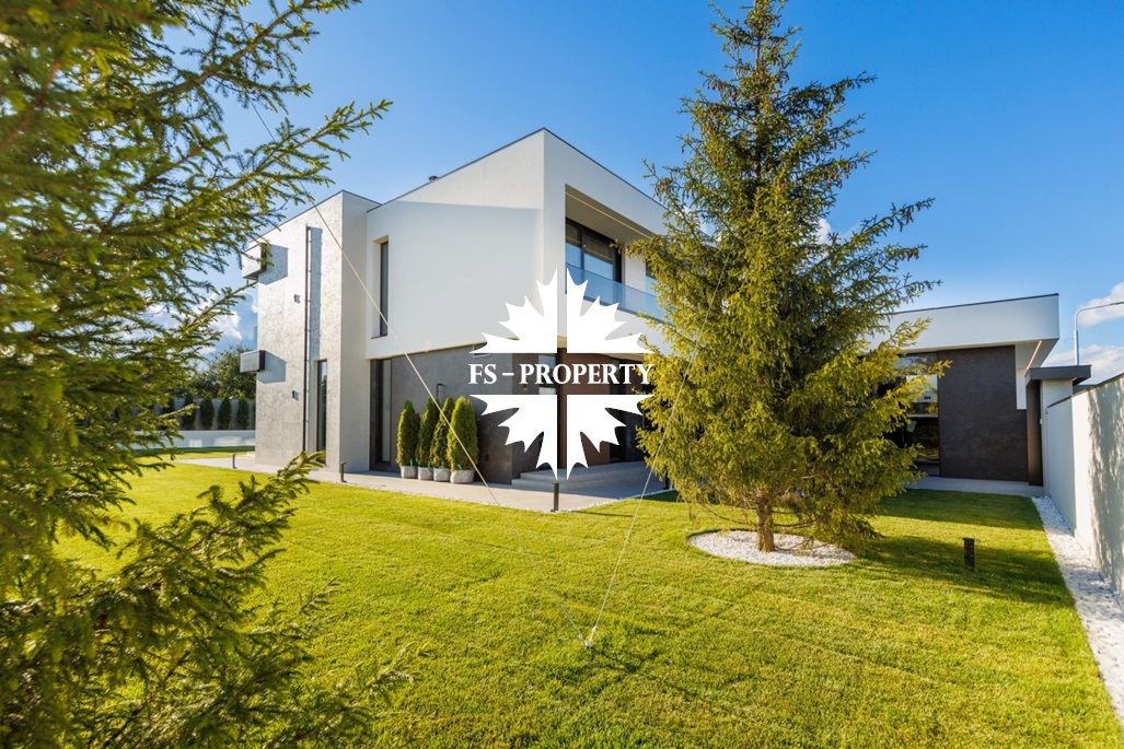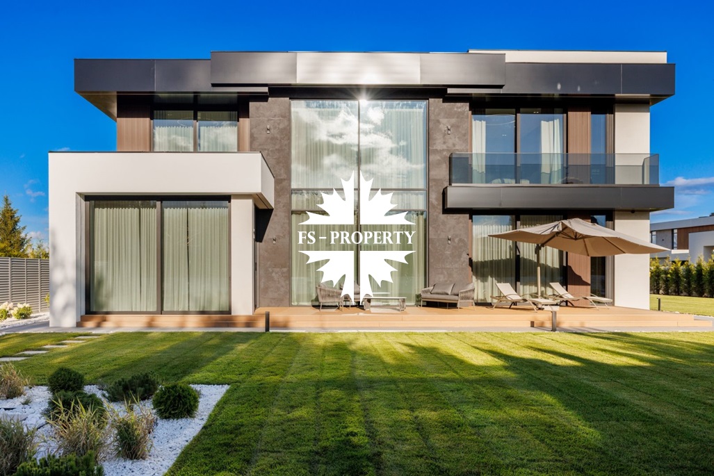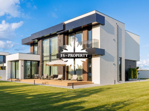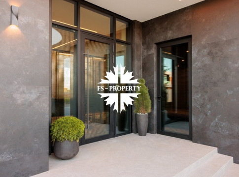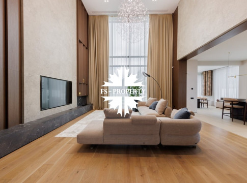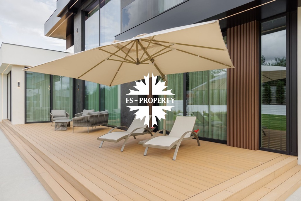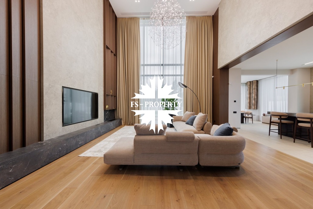 1 этаж (285м): гардероб при входе, кухня, просторная гостиная со вторым светом, столовая с панорамным остеклением, гостевая спальня с собственным санузлом и гардеробной, бойлерная с отдельным входом для обслуживания, гараж и навес на 2 автомобиля, просторная открытая терраса;