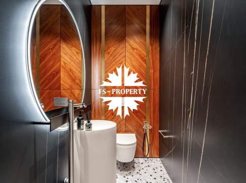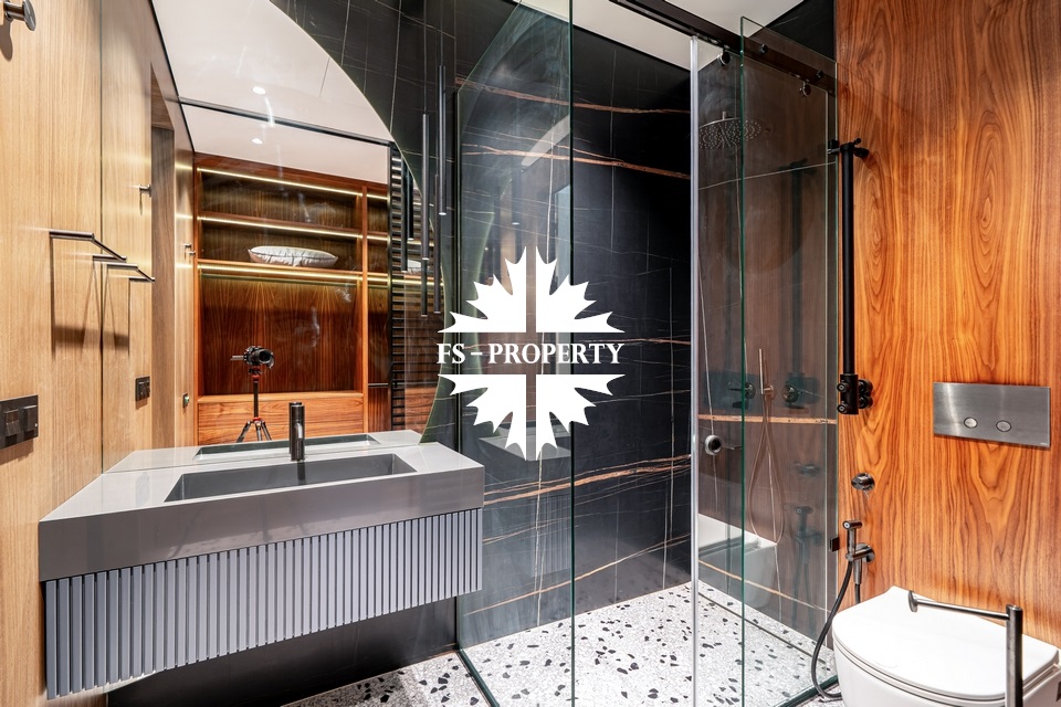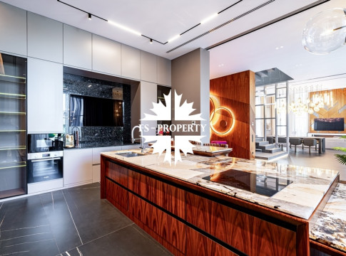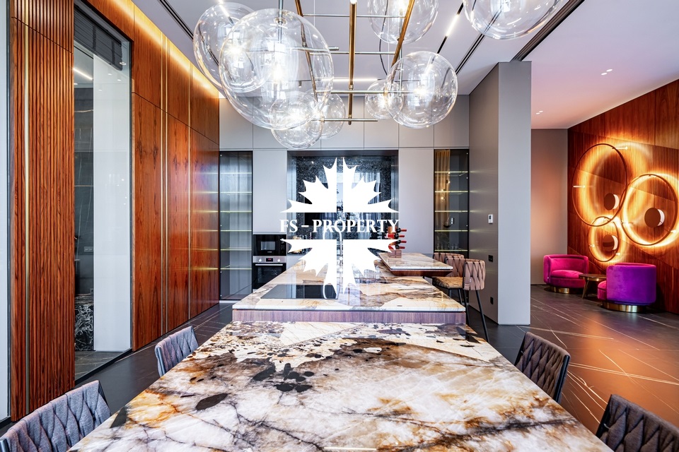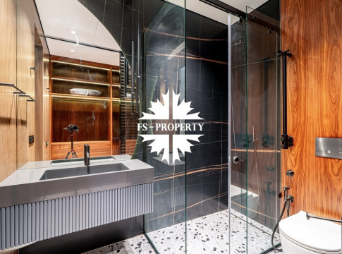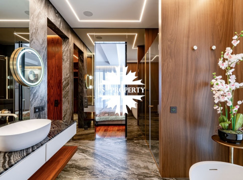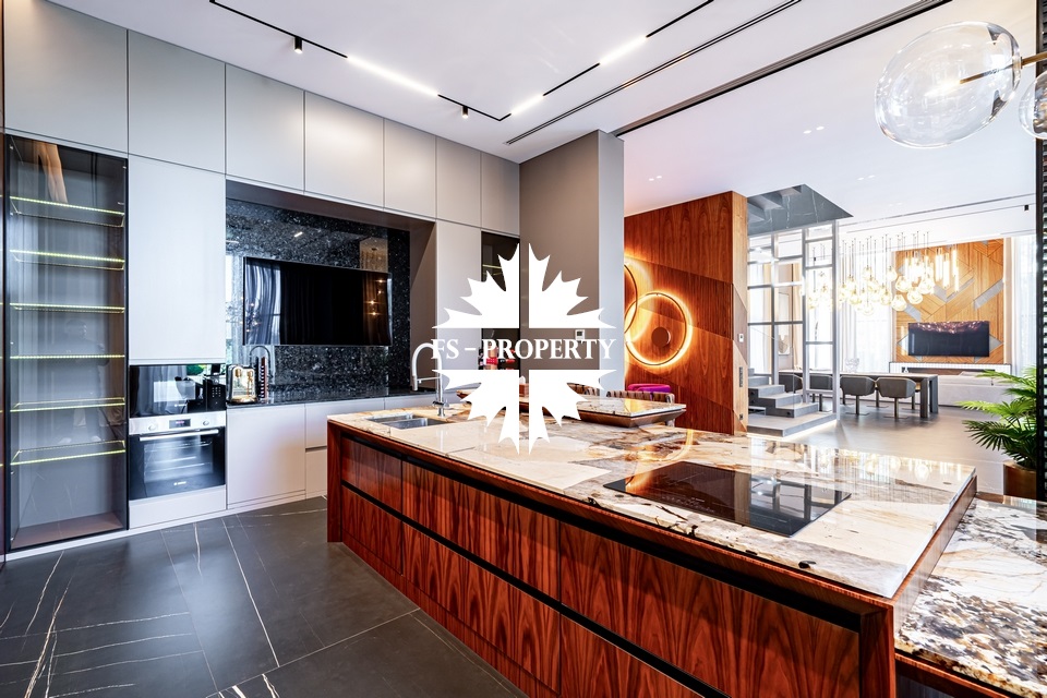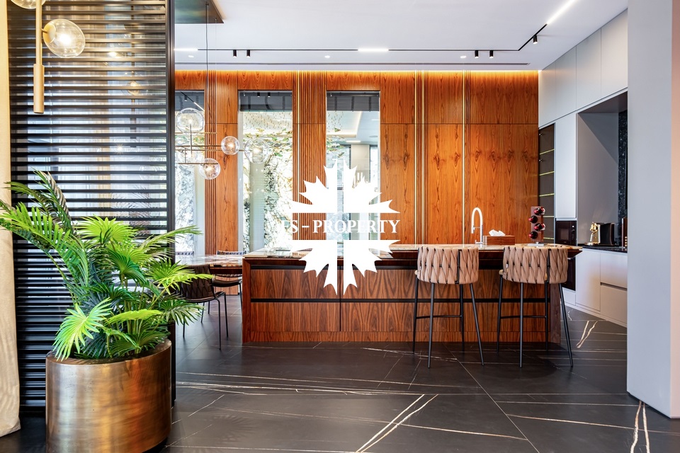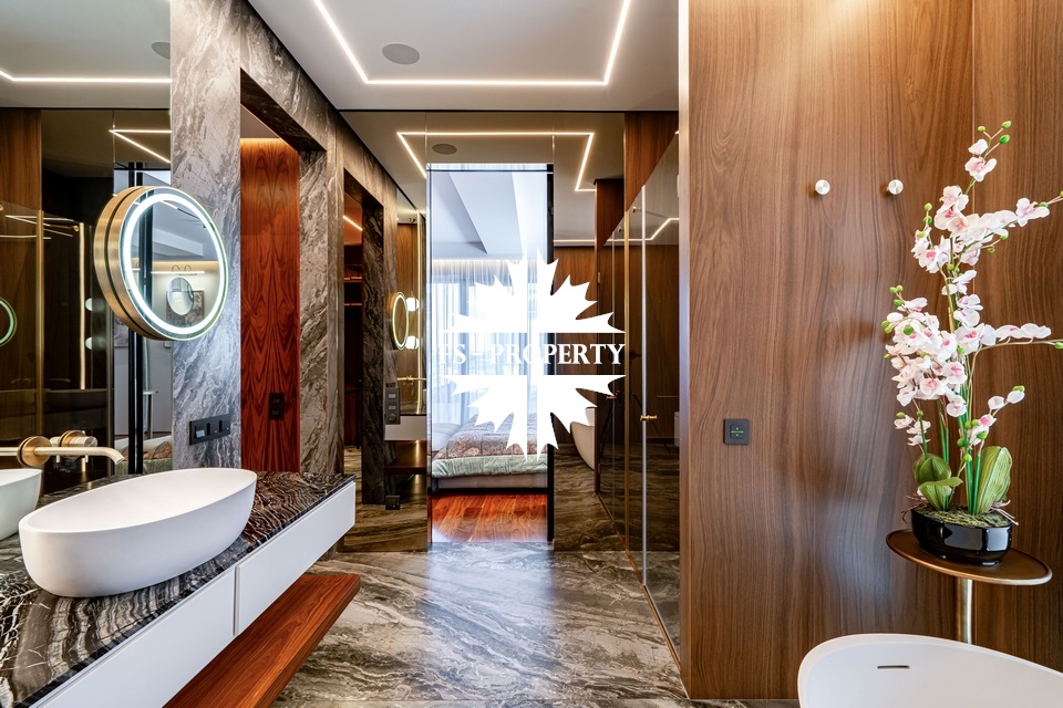 Интерьер создан студией Prosvirin Design и сочетает натуральные материалы и высокие технологии. В отделке использованы кварцит, редкие породы дерева, итальянская сантехника CEA и Antonio Lupi, свет от Центрсвет и ведущих итальянских брендов. Кухня оснащена техникой Bosch, холодильниками Liebherr, а каждая спальня — телевизорами Samsung. Мебель итальянских и португальских брендов Henge и Frato формирует атмосферу современного уюта и элегантной роскоши.