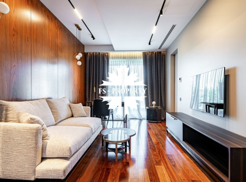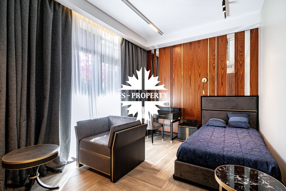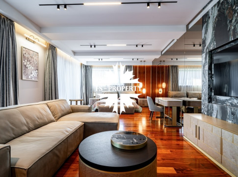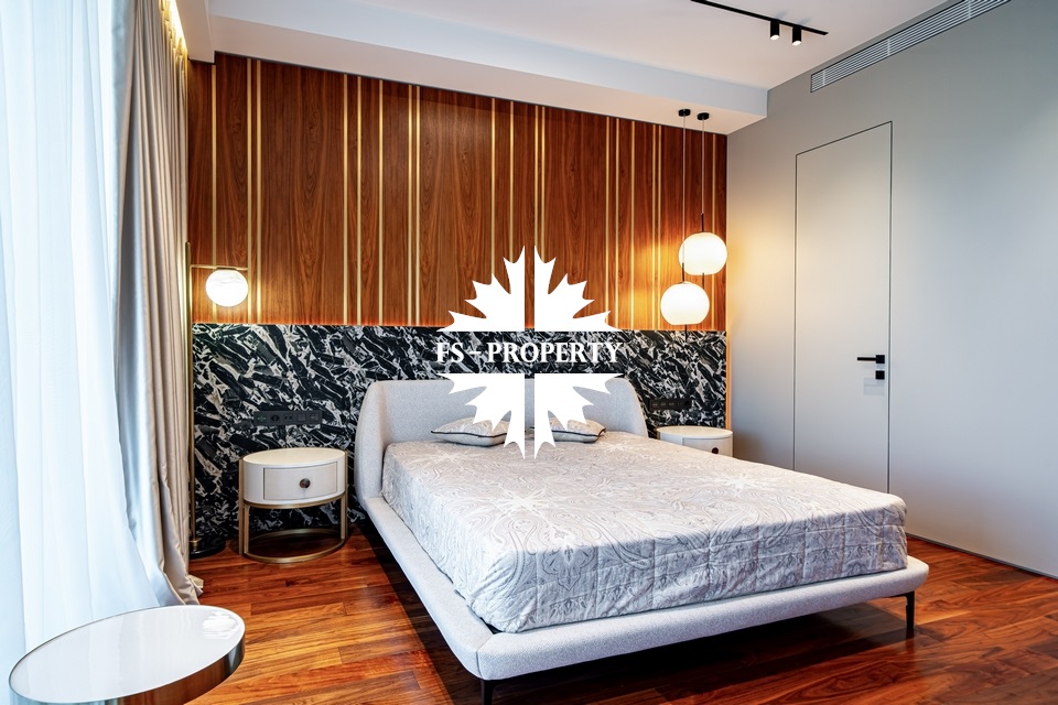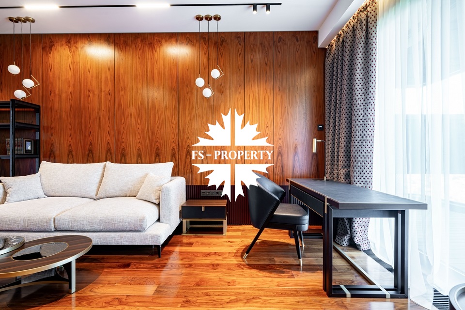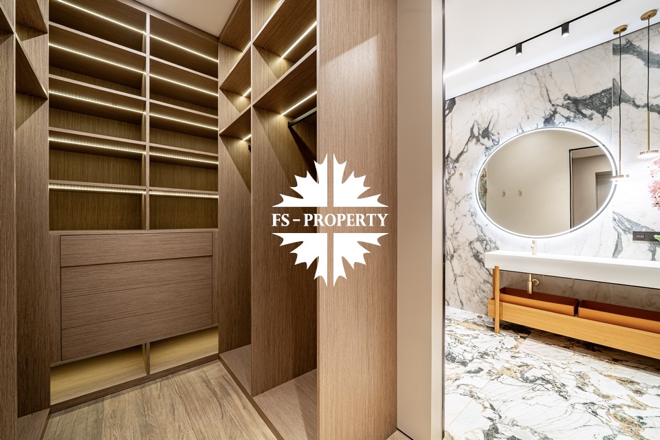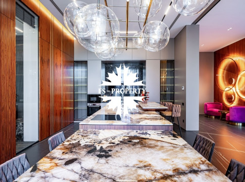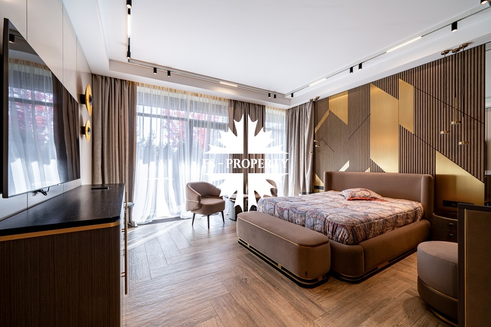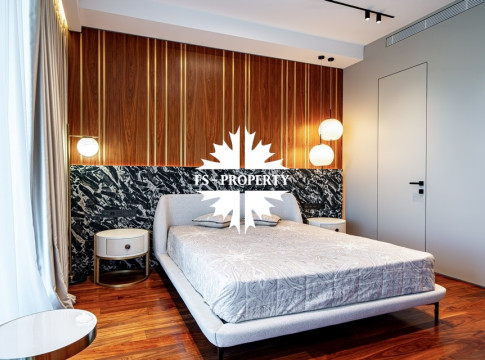 Интерьер создан студией Prosvirin Design и сочетает натуральные материалы и высокие технологии. В отделке использованы кварцит, редкие породы дерева, итальянская сантехника CEA и Antonio Lupi, свет от Центрсвет и ведущих итальянских брендов. Кухня оснащена техникой Bosch, холодильниками Liebherr, а каждая спальня — телевизорами Samsung. Мебель итальянских и португальских брендов Henge и Frato формирует атмосферу современного уюта и элегантной роскоши.