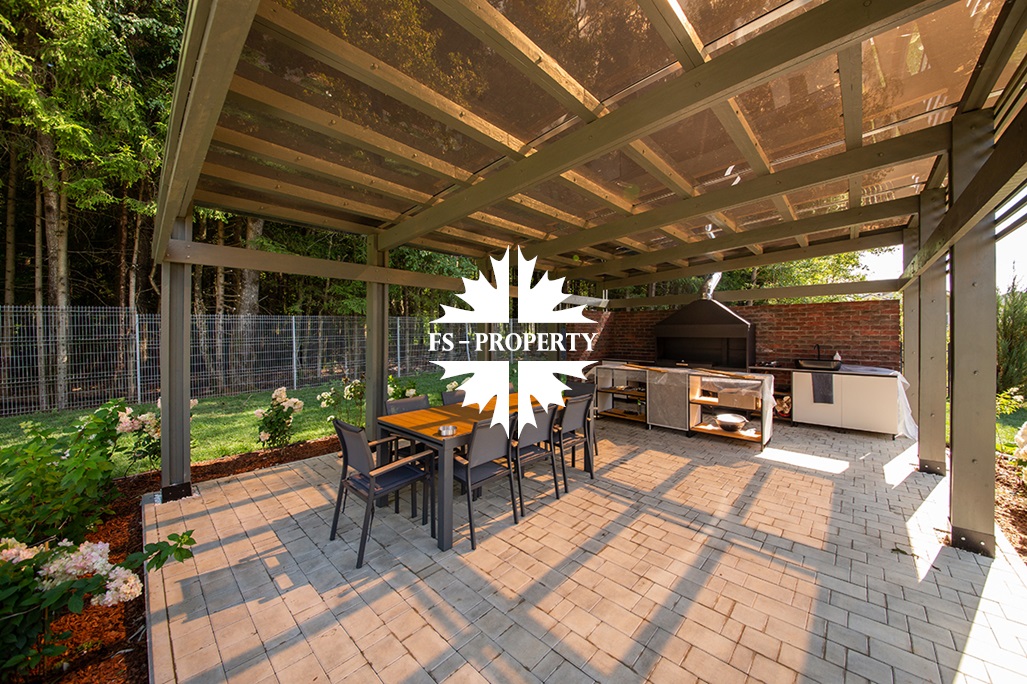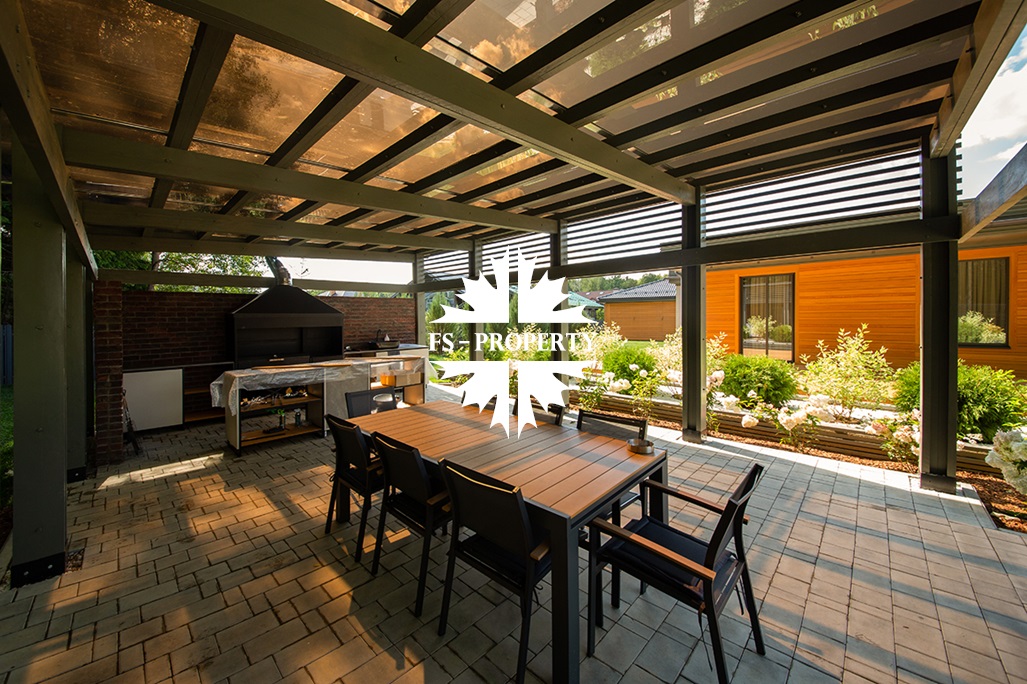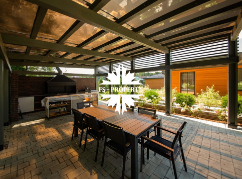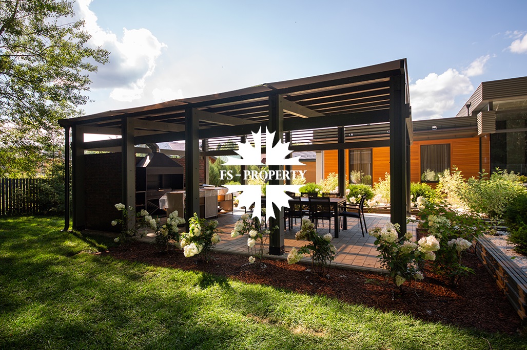 На участке располагается гараж 70 кв. м, зона барбекю 45 кв. м оснащена мангальной группой: мебель, остров, казан — для приготовления самых изысканных блюд и комфортного отдыха.