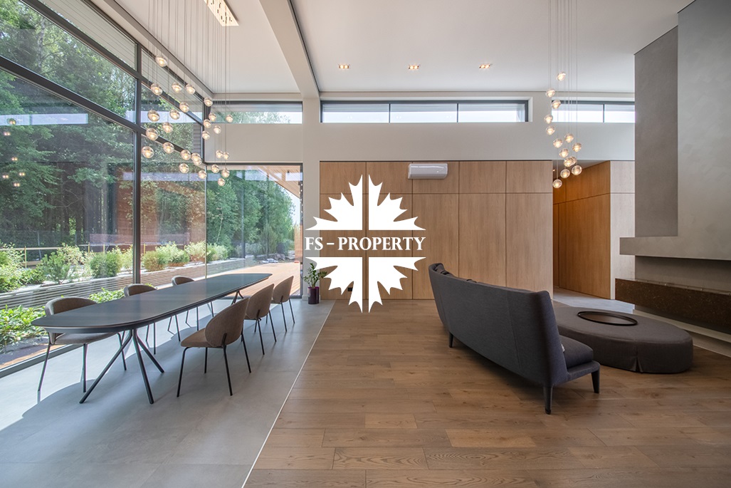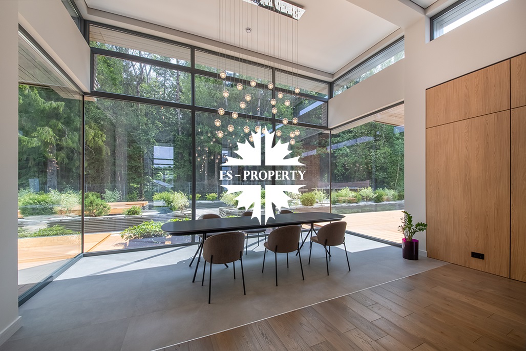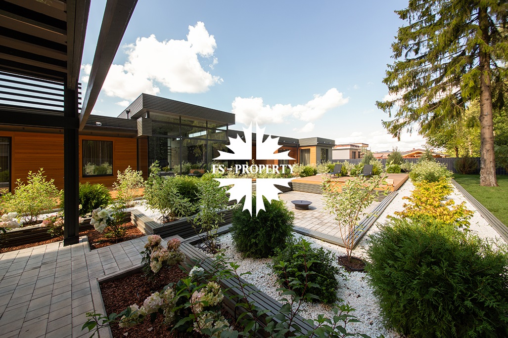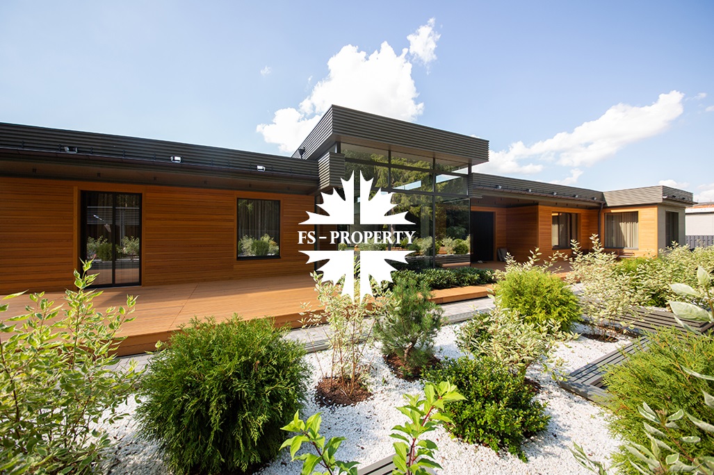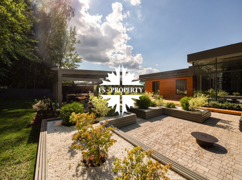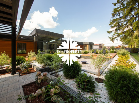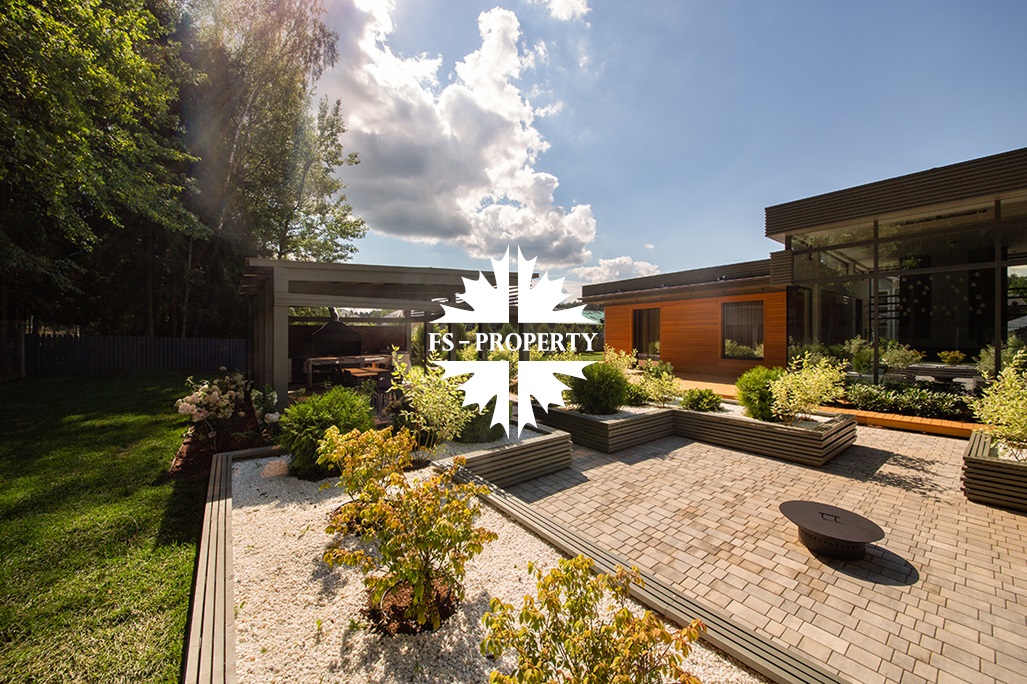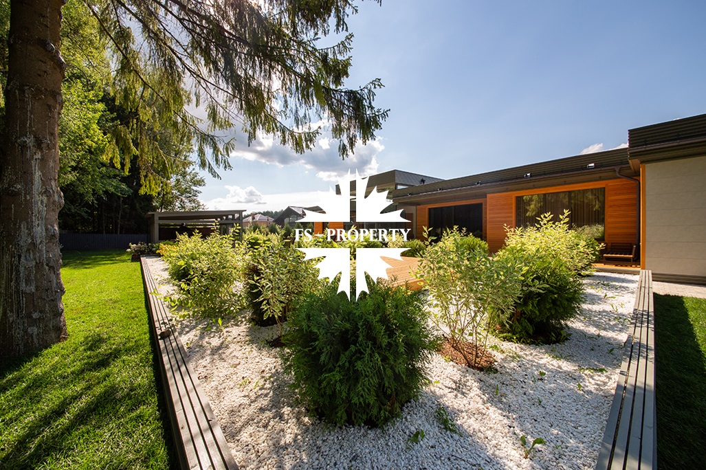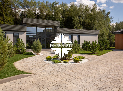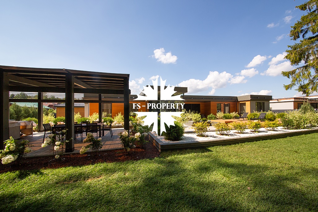На продажу предлагается новый одноэтажный дом в КП «Природный парк Каменка» общей площадью 420 кв. м на ландшафтном участке 25 соток. Дом построен по индивидуальному проекту. К материалам строительства были применены газобетонные блоки. Облицовка фасада выполнена из японских вентилируемых фасадов и лиственницы. Панорамное остекление, практически все окна в доме с видом на лес.