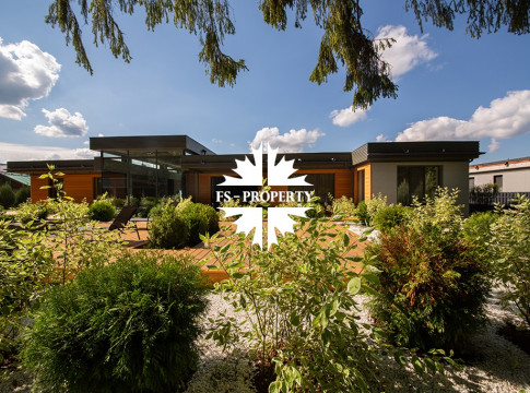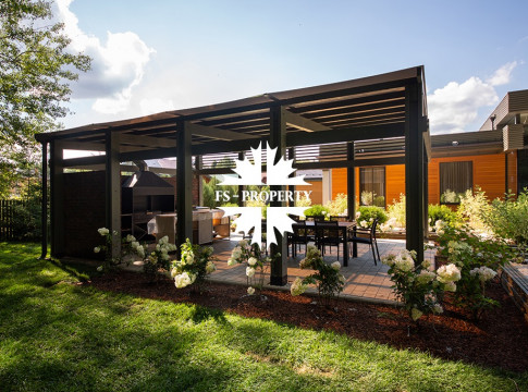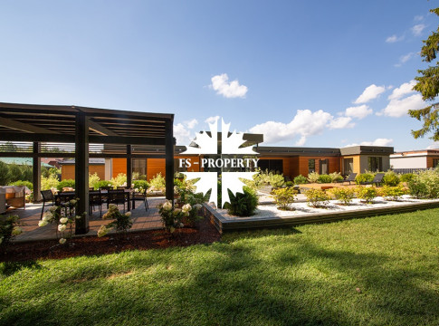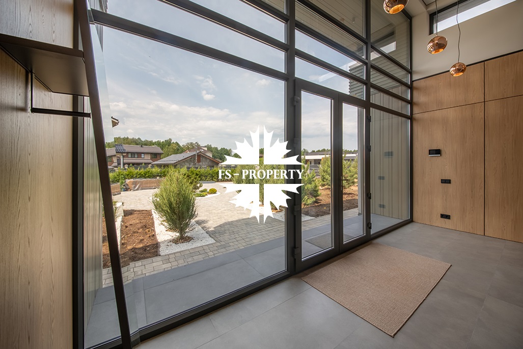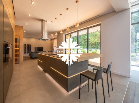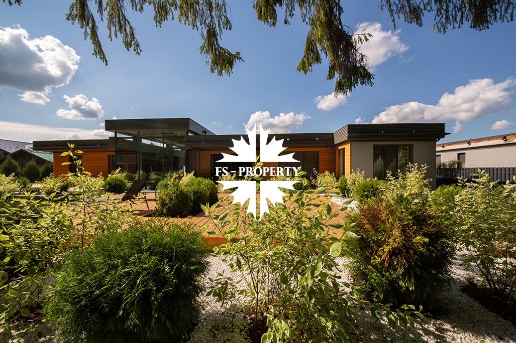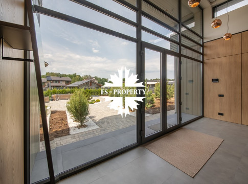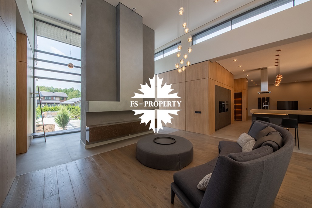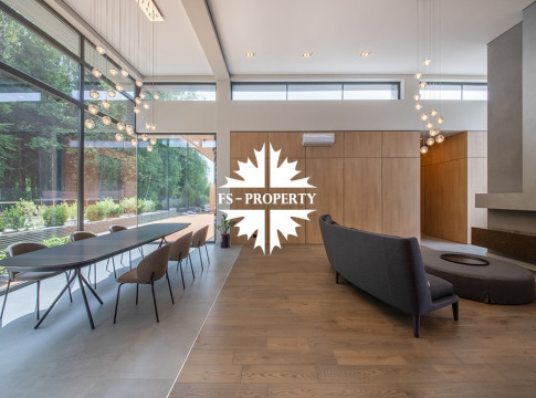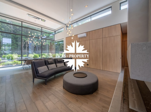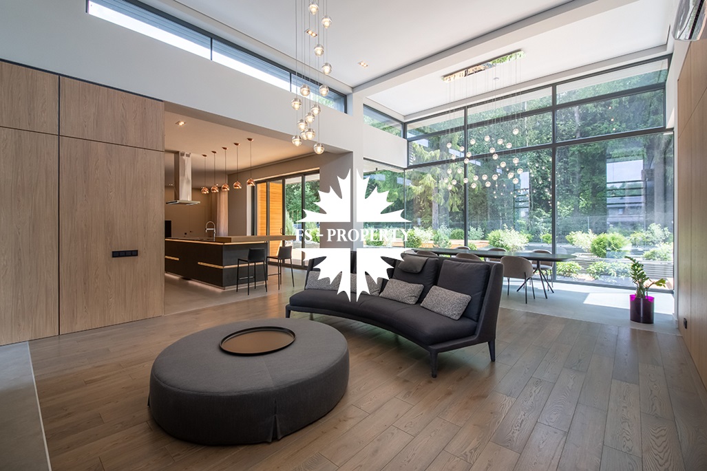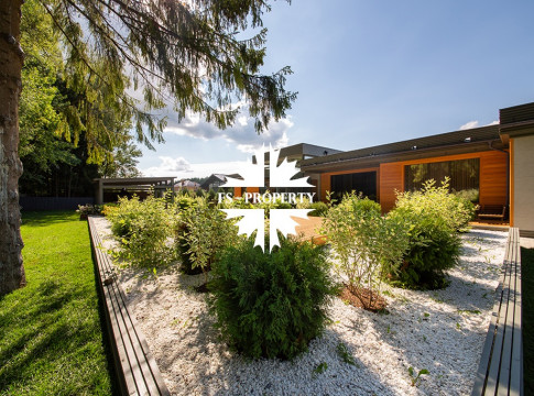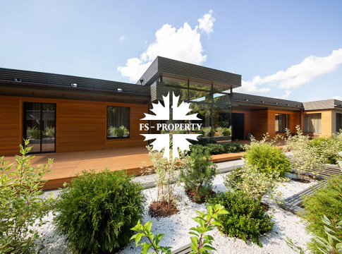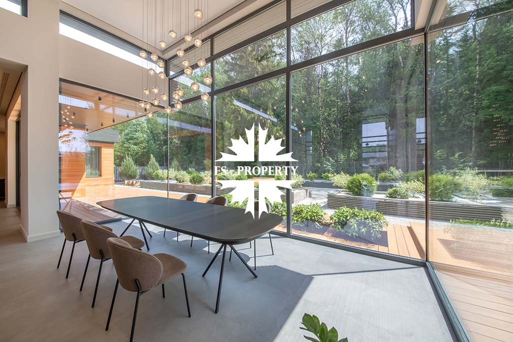 На продажу предлагается новый одноэтажный дом в КП «Природный парк Каменка» общей площадью 420 кв. м на ландшафтном участке 25 соток. Дом построен по индивидуальному проекту. К материалам строительства были применены газобетонные блоки. Облицовка фасада выполнена из японских вентилируемых фасадов и лиственницы. Панорамное остекление, практически все окна в доме с видом на лес.