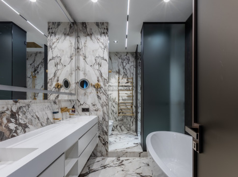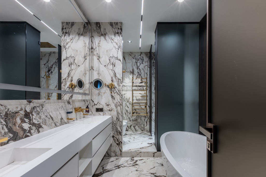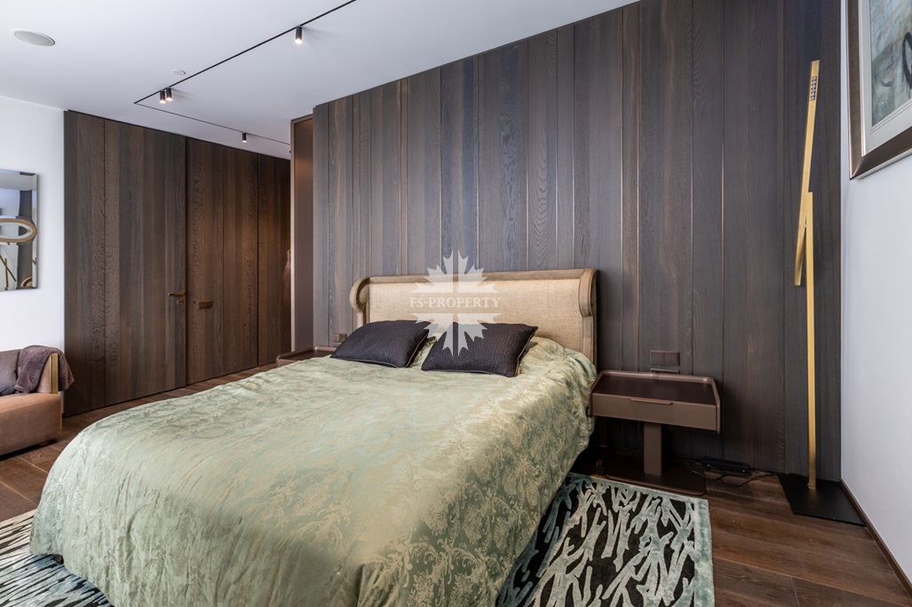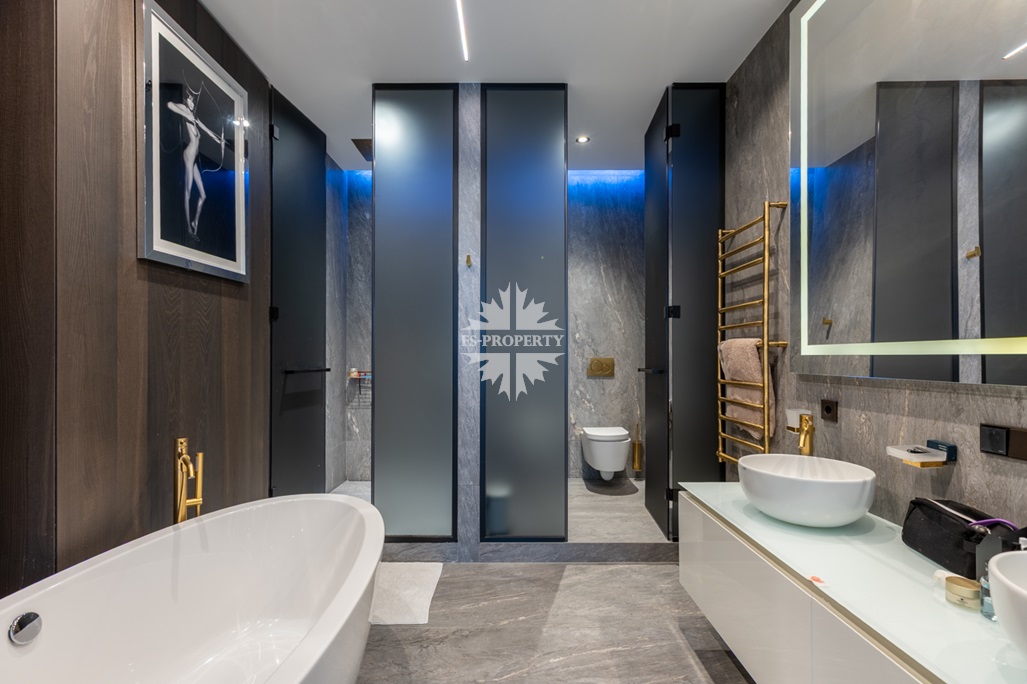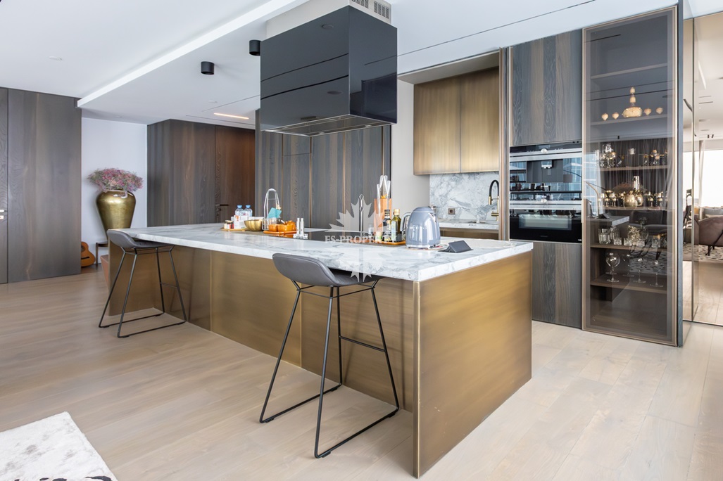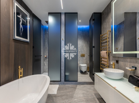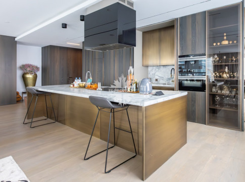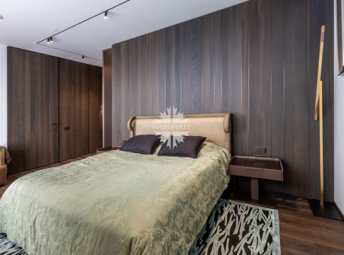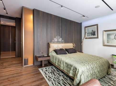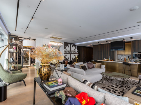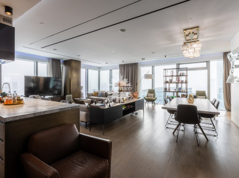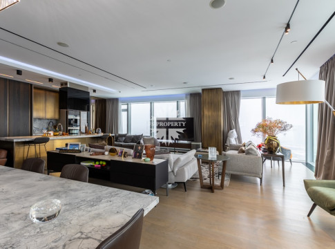 Современный и комфортный интерьер. Дорогие качественные материалы — натуральное дерево, мрамор. Встроенная техника премиум-класса, система «умный дом» для климата, освещения и безопасности. Просторная гостиная-кухня-столовая. Панорамные окна от пола до потолка заливают пространство светом днём и огнями города ночью — вид на Москва-Сити и реку прямо с дивана.