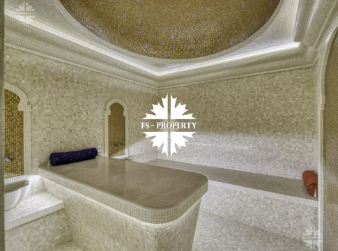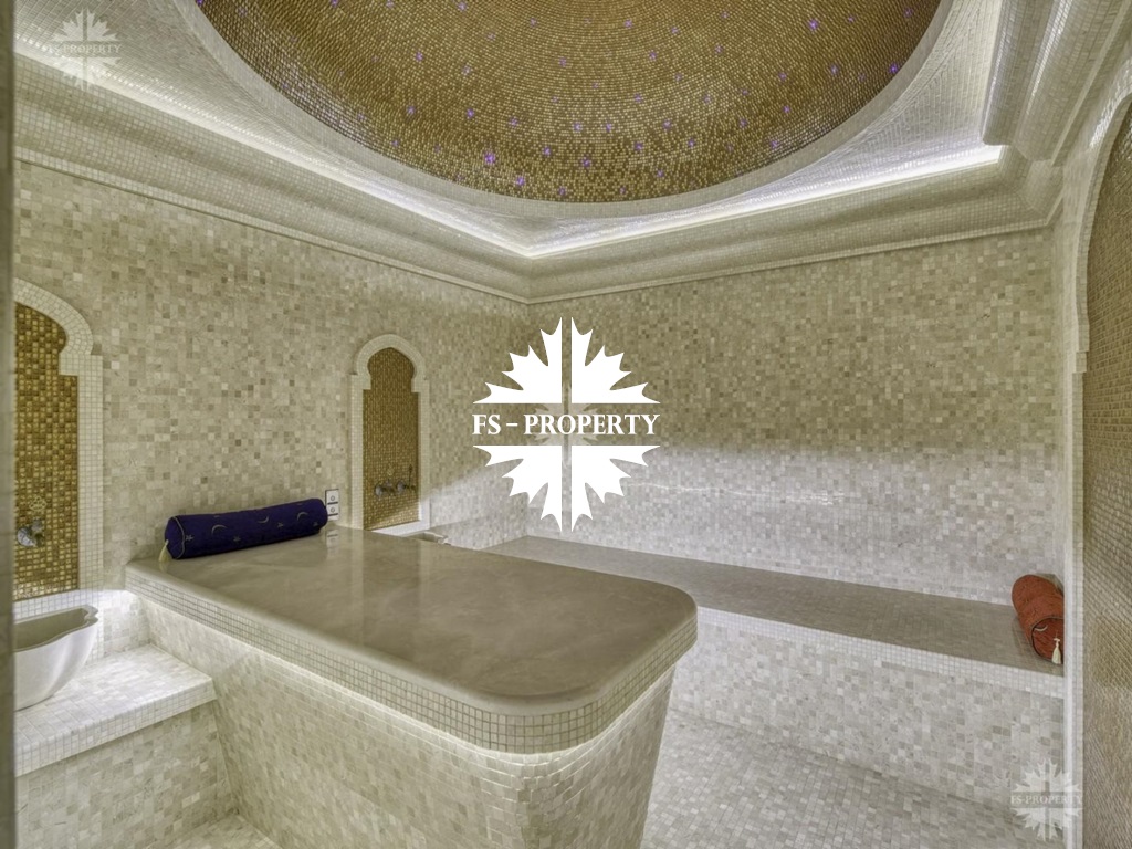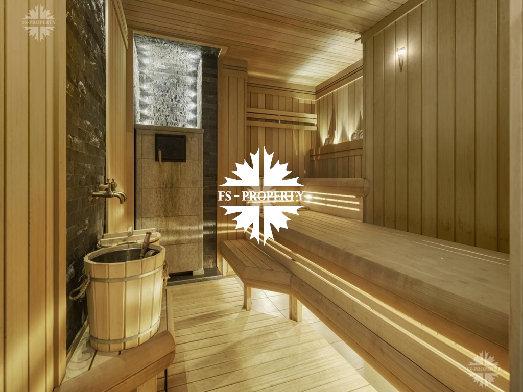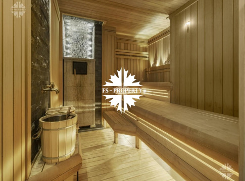 Из чайного домика есть выход на 1 этаж в зону бассейна с чашей в 12 м с противотоком. Там же расположена сауна, хамам, сан узел, душевые.