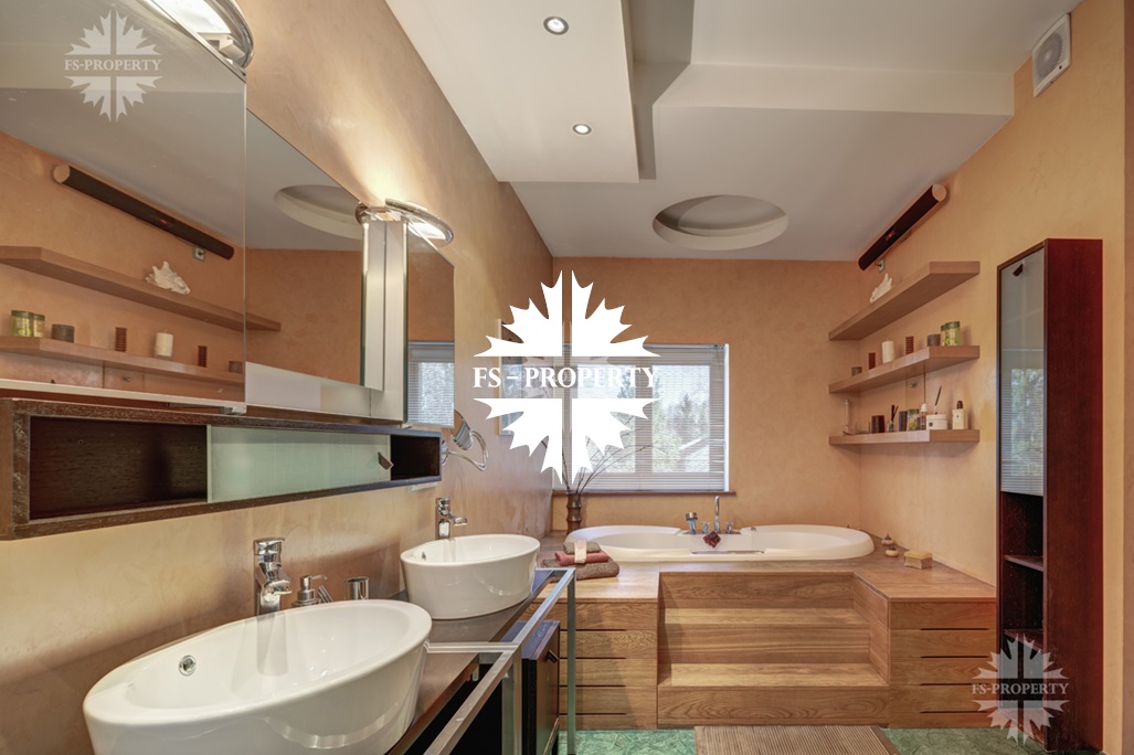 На территории оборудована баня с комнатой отдыха и кухней, блок для охраны, место для барбекю, гараж на 4 машино-места, открытая парковка на 3 машино-места.