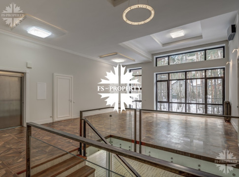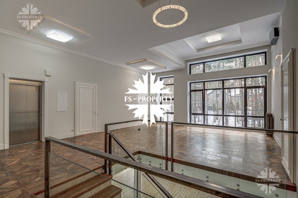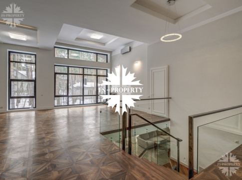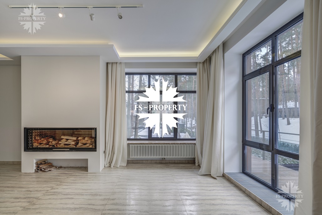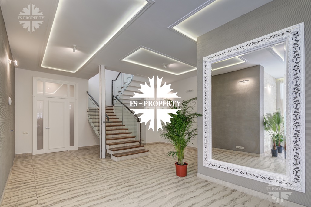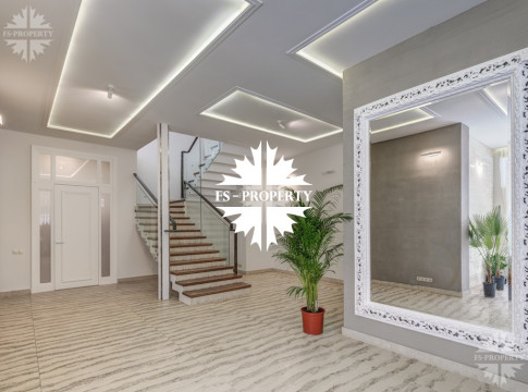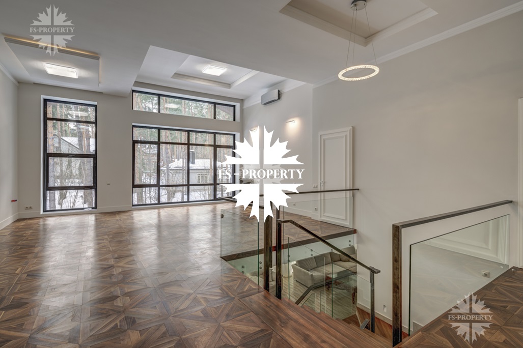 2 этаж: большой холл, 2 кухни, парадная и рабочий кабинет с санузлом и гардеробной, гостиная с камином, панорамные окна, выход на Патио, на участке терраса с газоном и туями.
