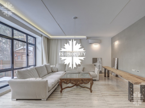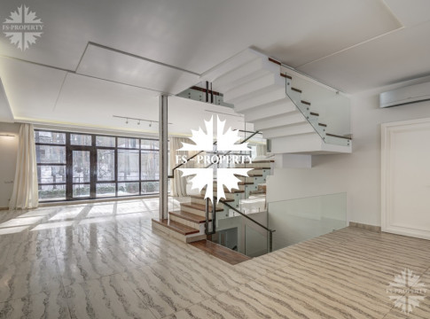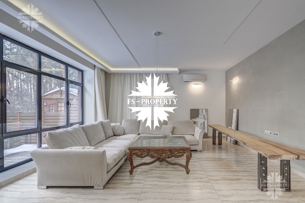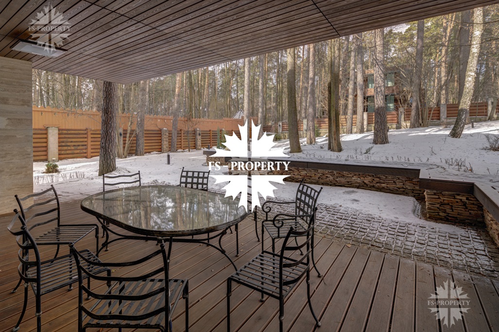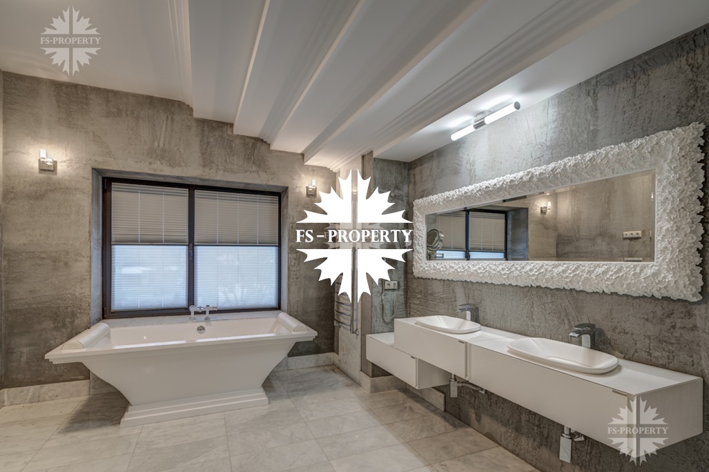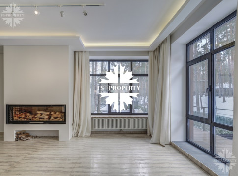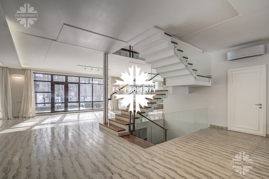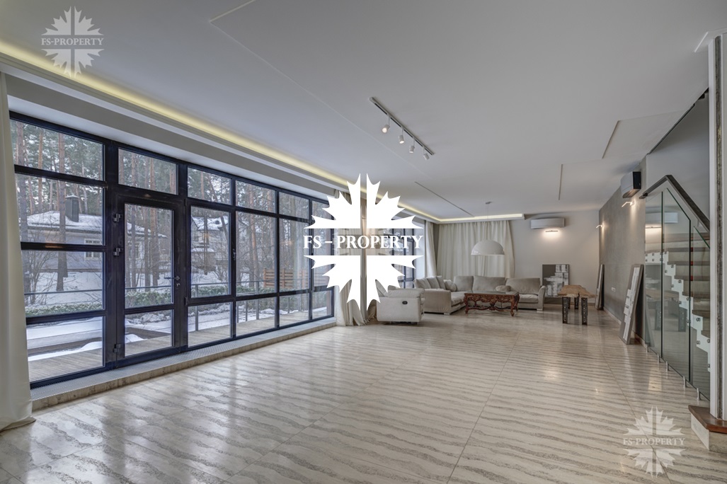 2 этаж: большой холл, 2 кухни, парадная и рабочий кабинет с санузлом и гардеробной, гостиная с камином, панорамные окна, выход на Патио, на участке терраса с газоном и туями.
