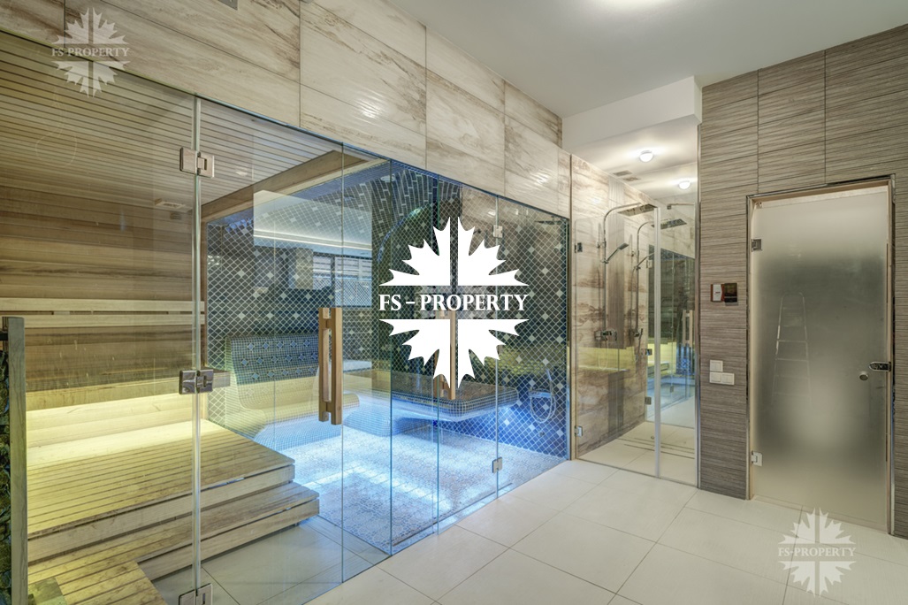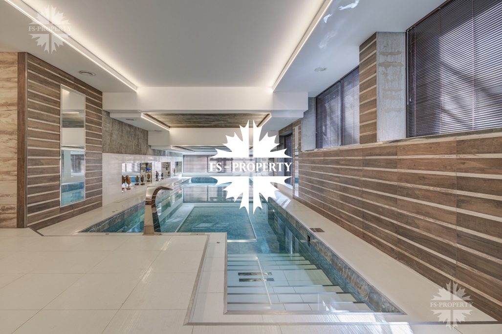 1 этаж: гараж на 3 машины, квартира для персонала, холл, санузел, постирочная, бассейн 3,5 на 12, сауна, хамам, спортивный зал.