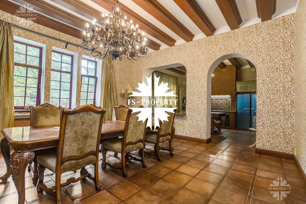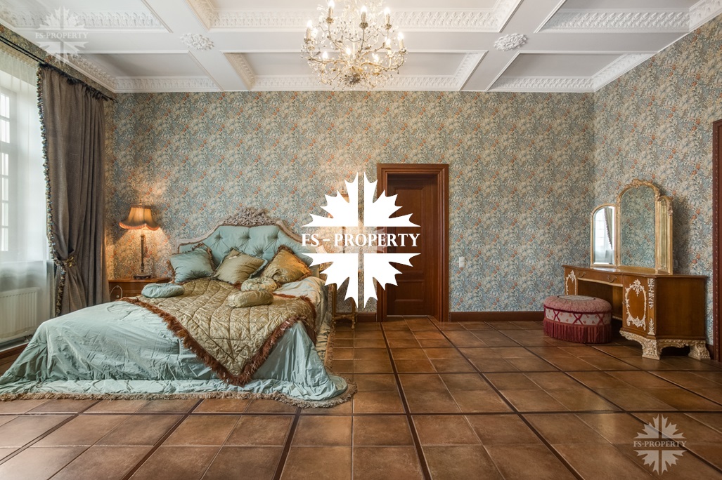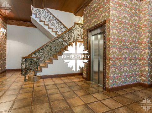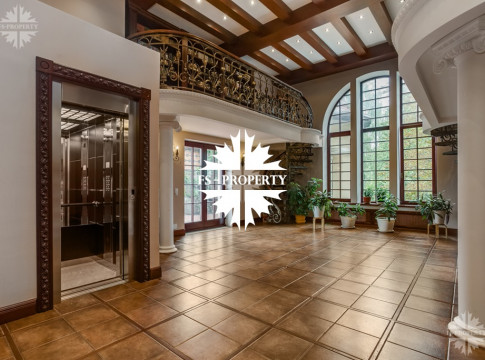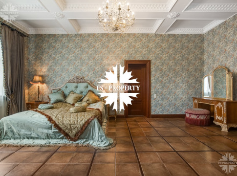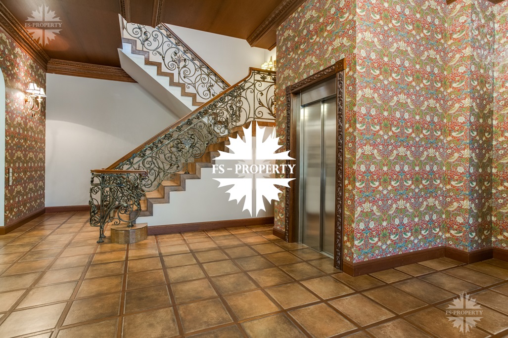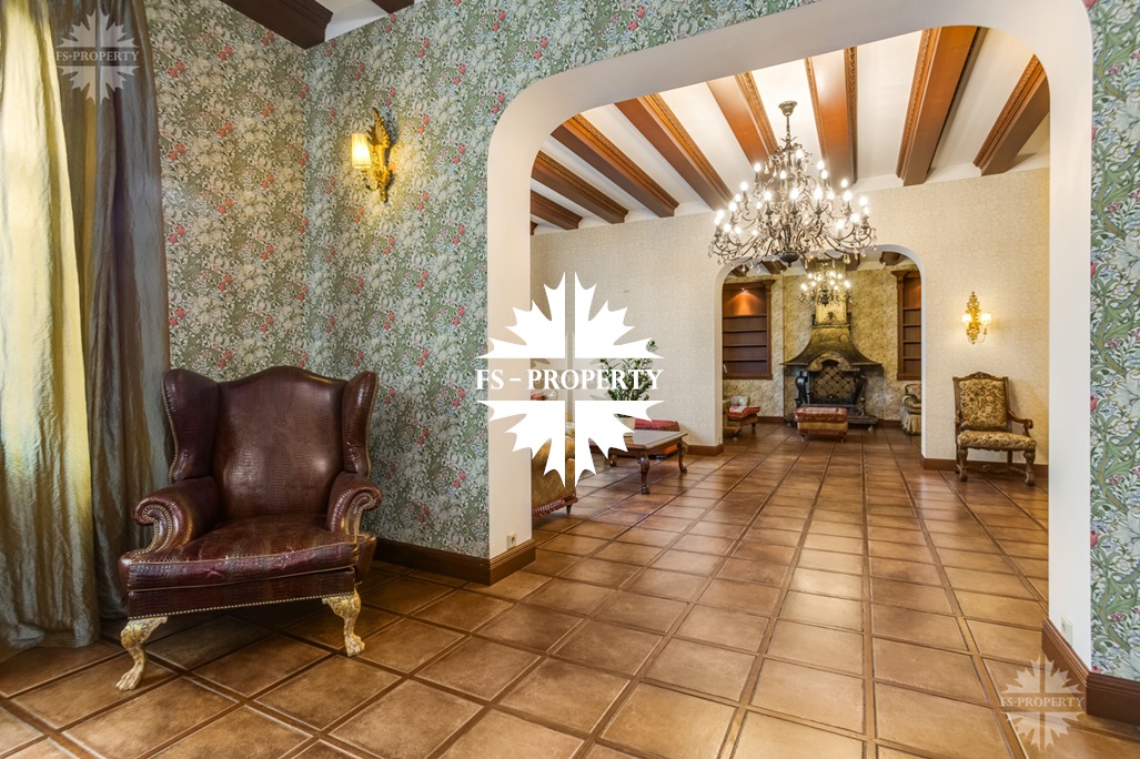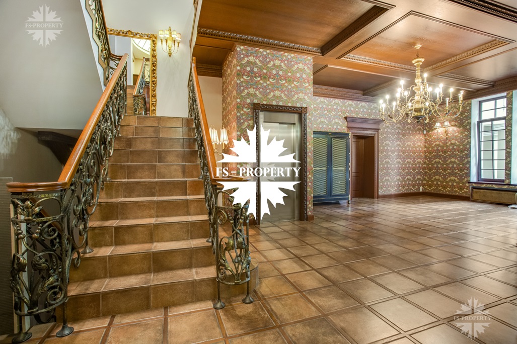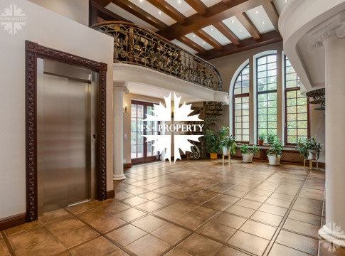 Отделка коттеджа выполнена в стиле Английского замка. Использованы материалы, привезенные из Англии, Италии. Высокое качество отделки. Дом полностью меблирован, готов к проживанию. Оборудован лифт в доме.