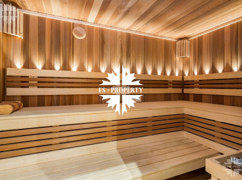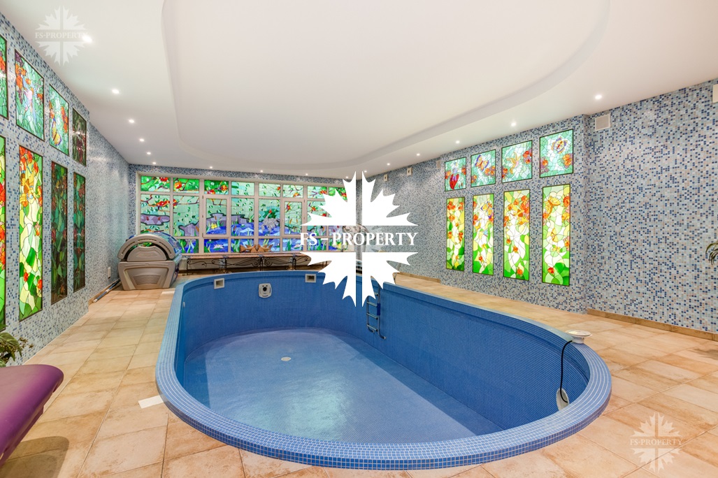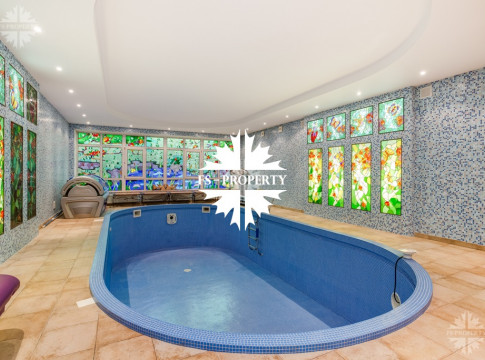 1 этаж: прихожая, санузел, гардеробная, кухня, столовая, гостиная с камином, большая комната свободного назначения (может быть второй гостиной), застекленная веранда с барбекю с выходом на участок, бассейн 9х4, сауна, хамам.