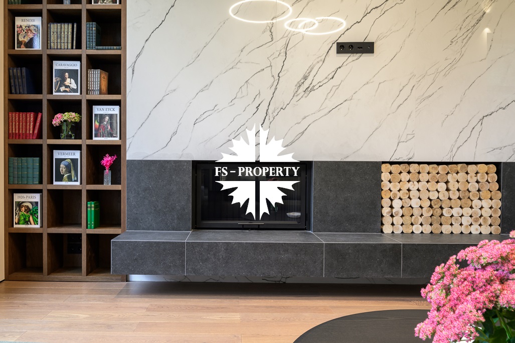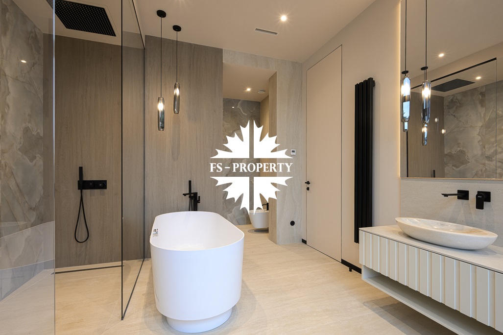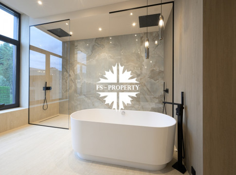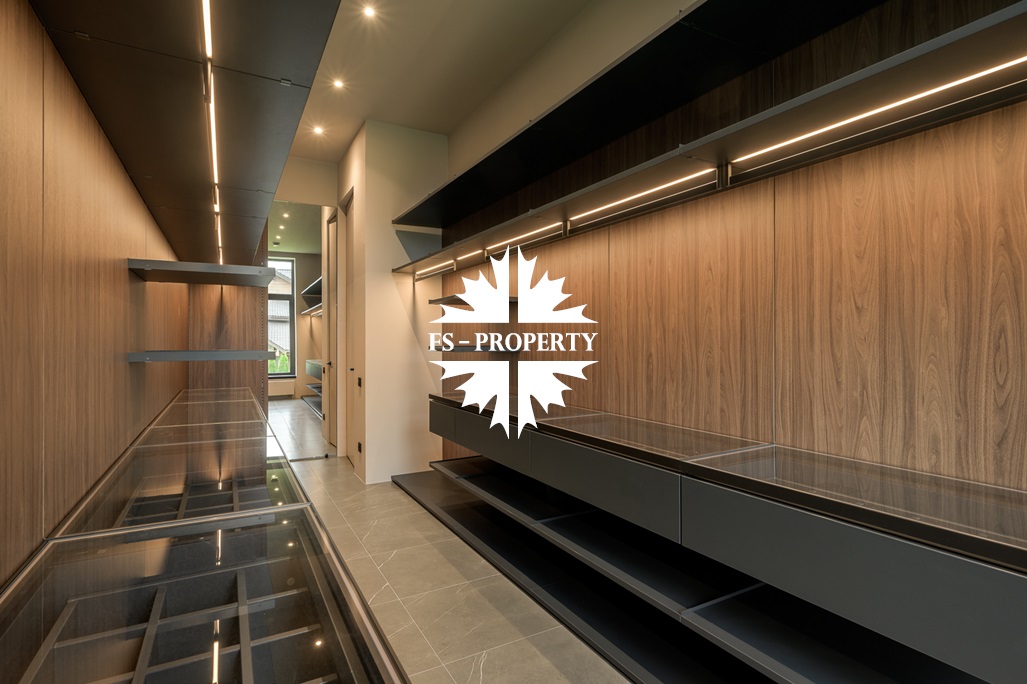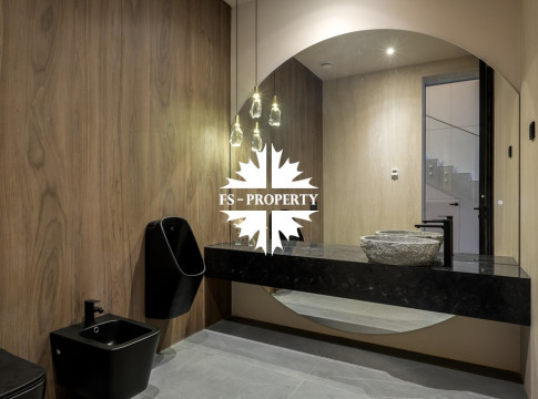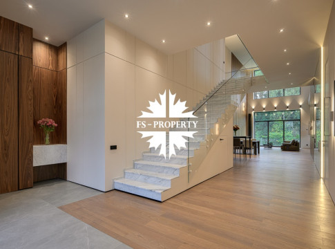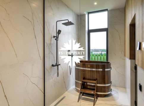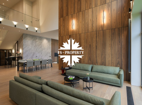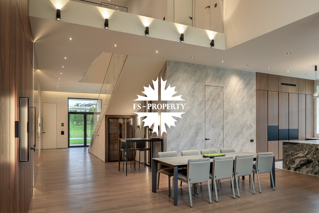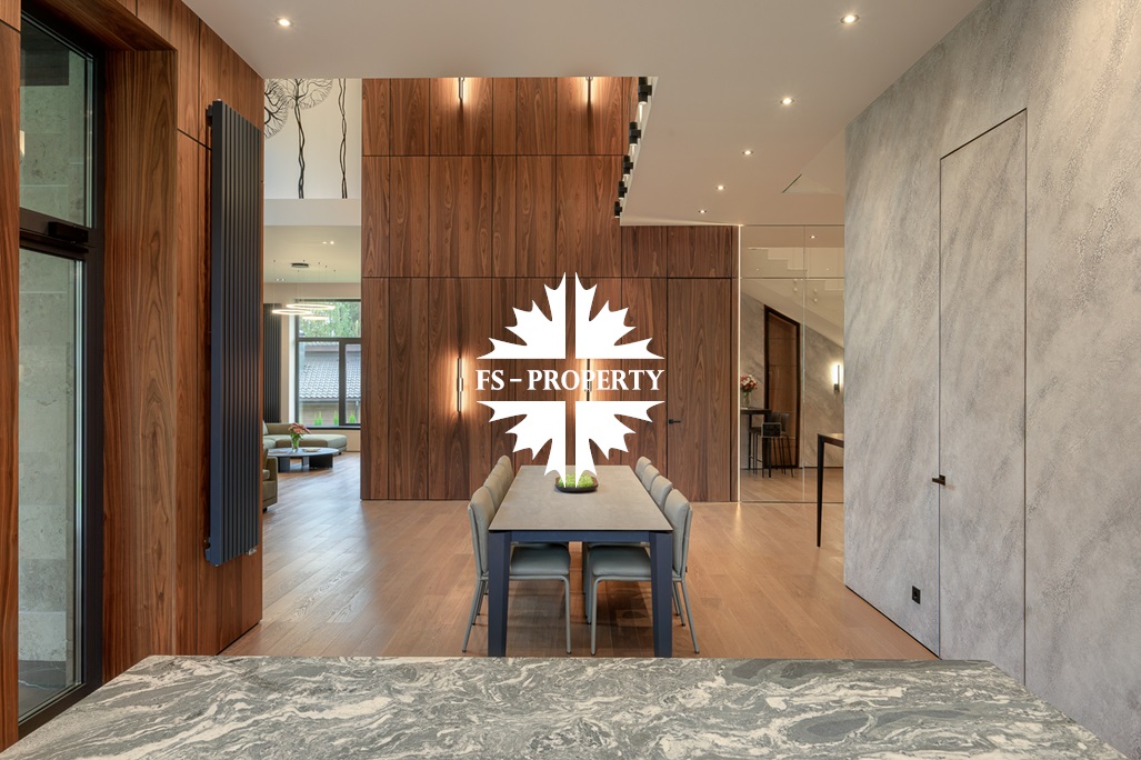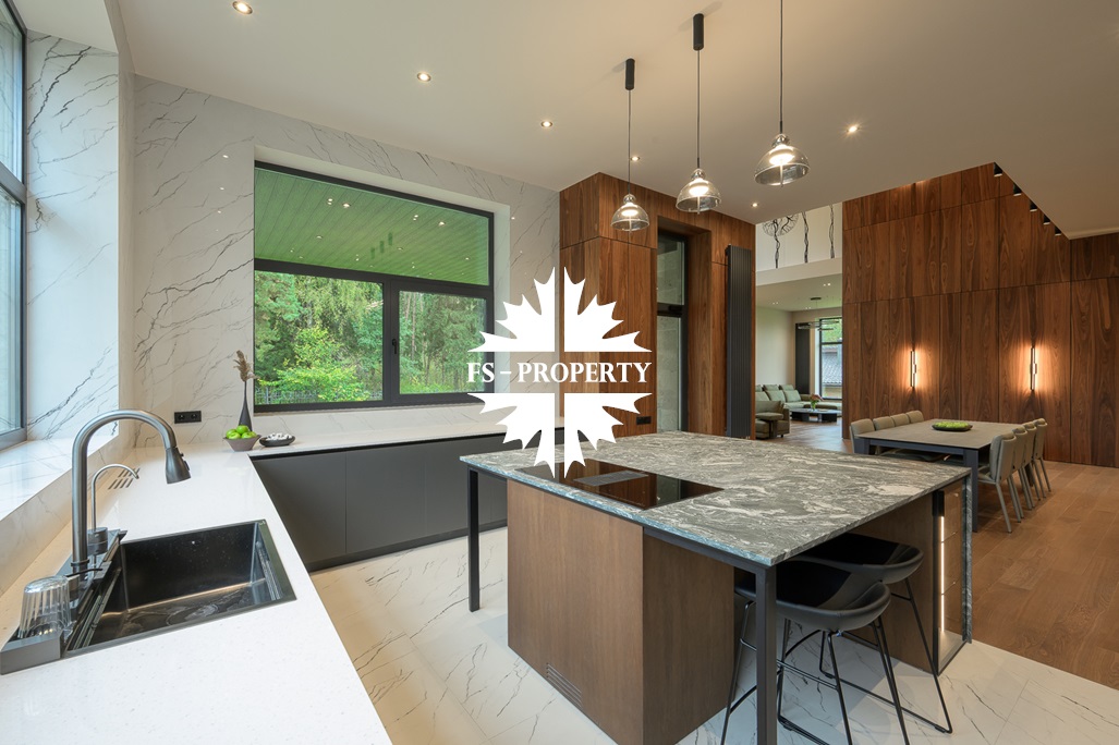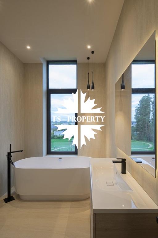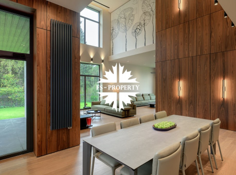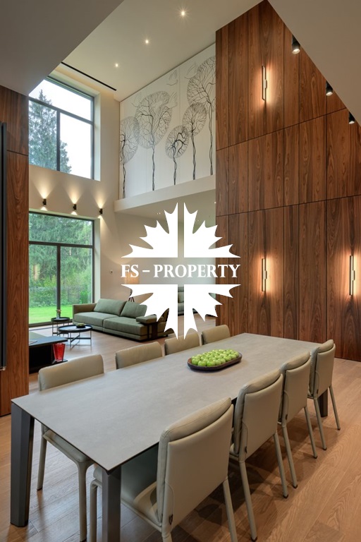 Общественная зона: Полностью укомплектованная мебелью гостиная-столовая-кухня - единое пространство со вторым светом, общей площадью 115 м2 и объемом - 570 м3 (выделено 5 функциональных зон: медиа зона с ТВ и дровяным камином, лаунж зона с двумя большими диванами, столовая со столом на 8 персон (с возможностью увеличения до 20), зона бара с двумя сервантами и барной стойкой, парадная кухня с островом 20 м2 (с доступом в рабочую кухню 12 м2)). Окна этого пространства смотрят на восток, юг и запад. Блок свободного назначения с санузлом и сауной (общая площадь блока 37 м2. Комната может использоваться как игровая, СПА, спортзал, кинотеатр, бильярдная и т.д.). Крытая терраса с видом на лес с доступом из кухни и столовой. Хозяйский санузел первого этажа, оснащенный умывальником, унитазом, биде и писсуаром.