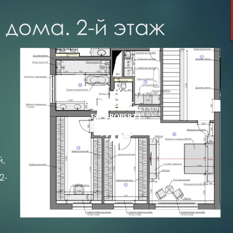 Второй этаж: общая площадь 80 кв. м.: мастер-спальня с санузлом и гардеробной, три спальни с санузлами и гардеробными комнатами, игровая комната или кабинет.