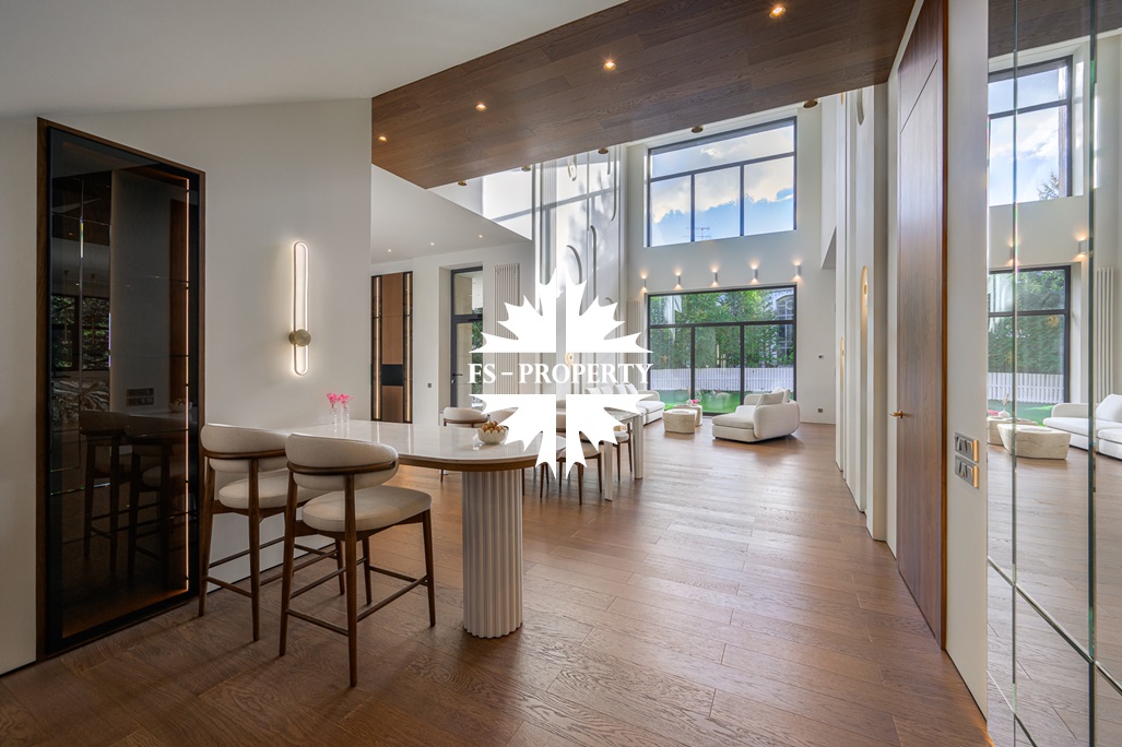 В доме возможно разместить до 7 спален, парадный холл 16 кв. м., гардеробная 16 кв. м., два кабинета 16 и 20 кв. м (с возможностью обустройства спальни или гардеробной), гостевой санузел с душевой кабиной, гостиная-столовая-кухня — единое пространство со вторым светом 106 кв. м. и кубатурой 540 кв. м. Окна ориентированы на три стороны: юго-восток, юго-запад и северо-запад.