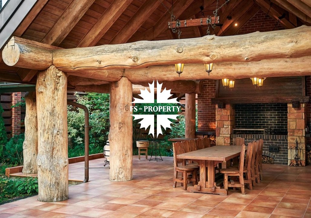 Широкие силуэты крыш с мощной системой стропил из хвойных пород деревьев органично сливаются с кронами вековых деревьев, создавая гармоничный ансамбль, где кирпичная кладка сочетается с бревнами ручной рубки.