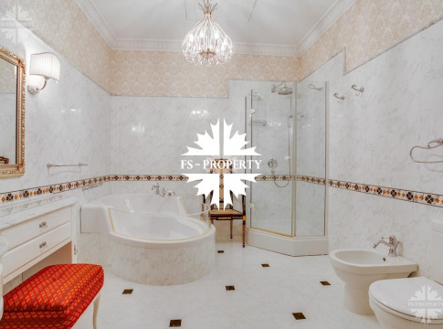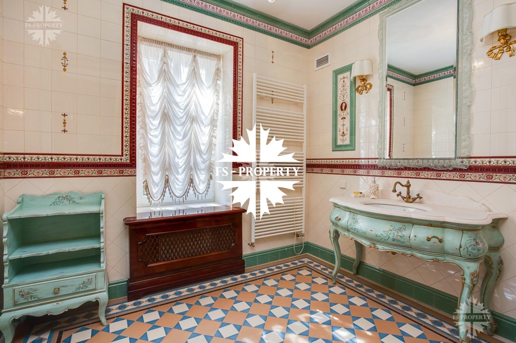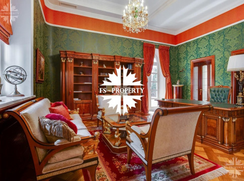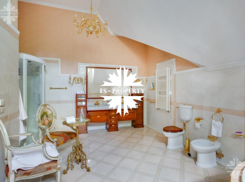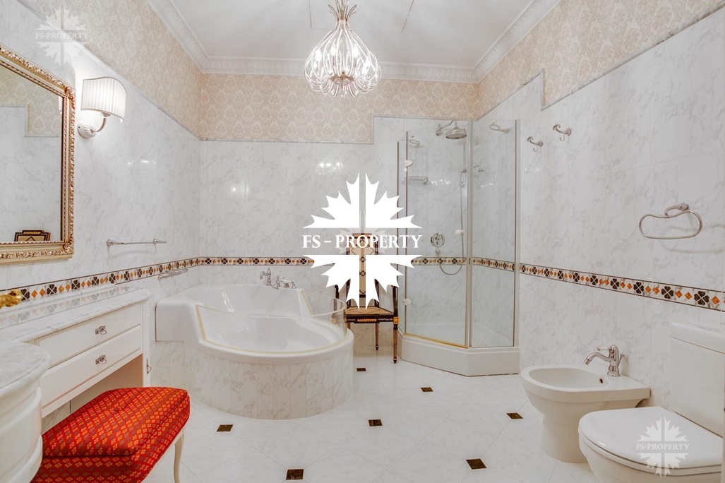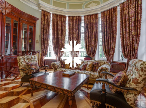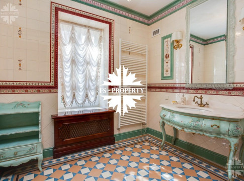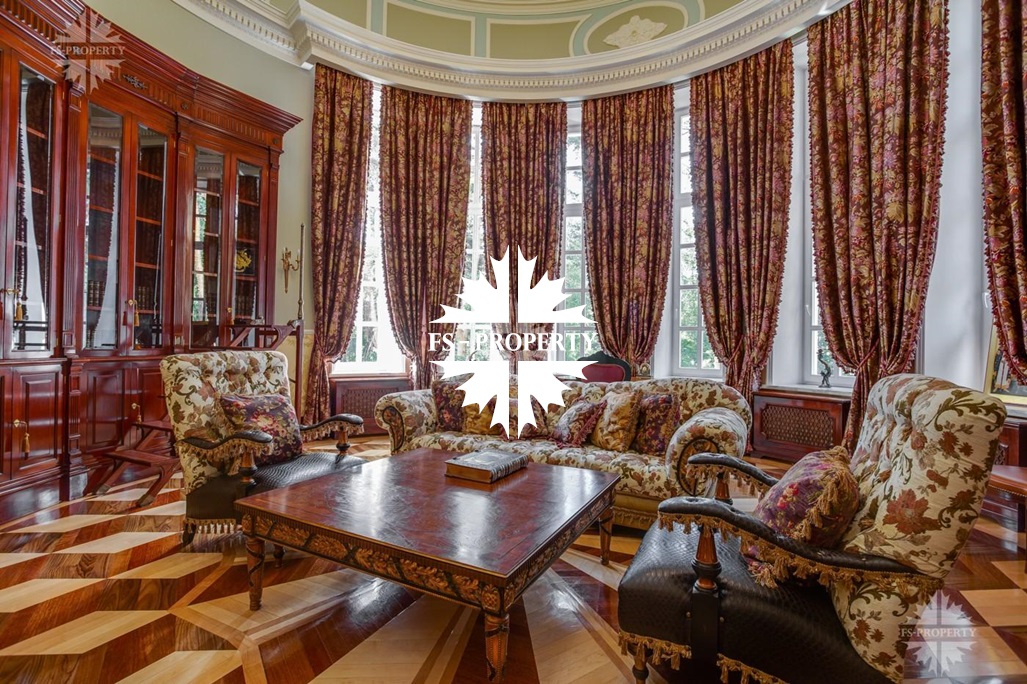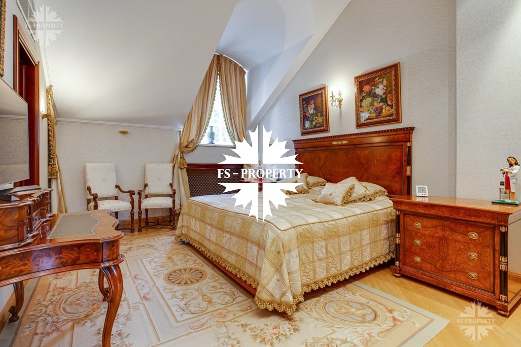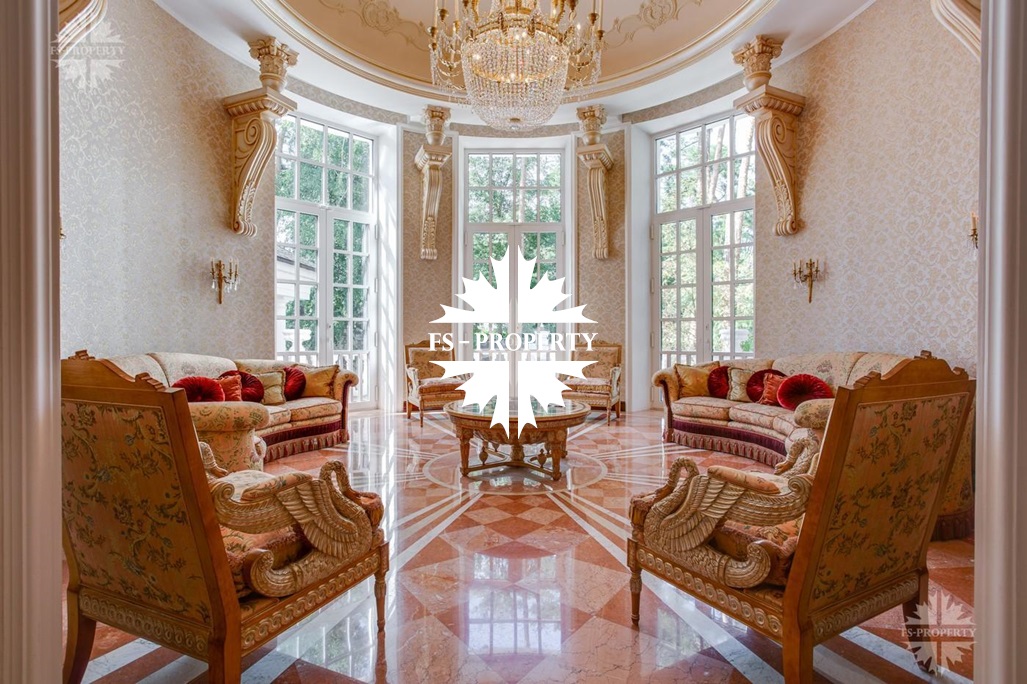 Интерьер дома выдержан в классическом стиле. Мебель ведущих мировых брендов гармонично сочетается с антикварными предметами интерьера. На территории есть 2 отдельно стоящих здания с гаражами и квартирами для персонала.