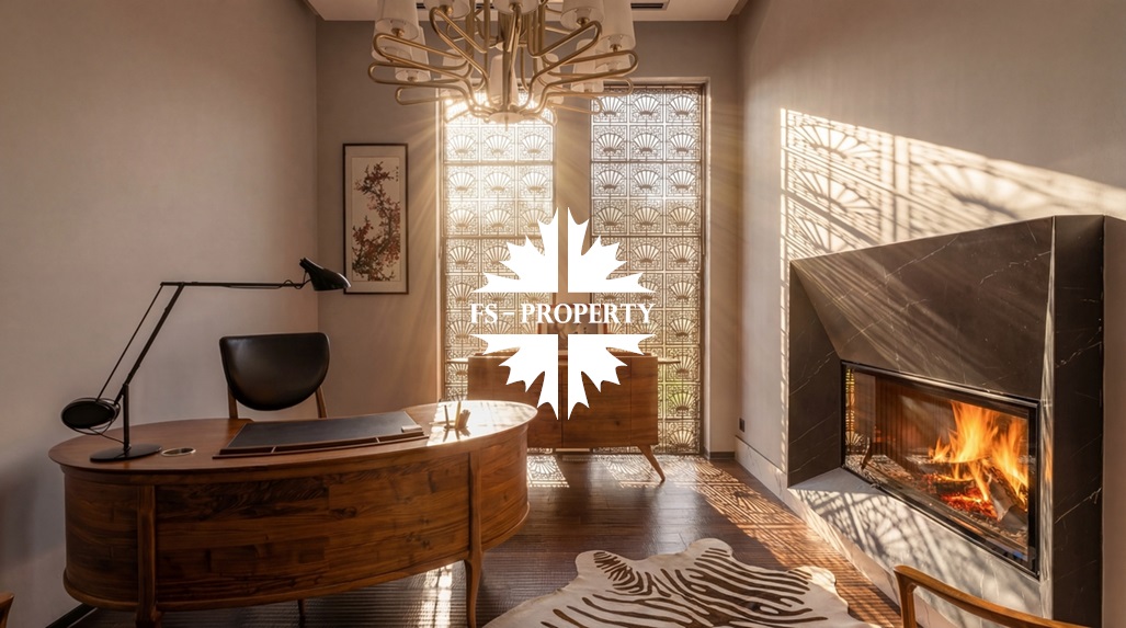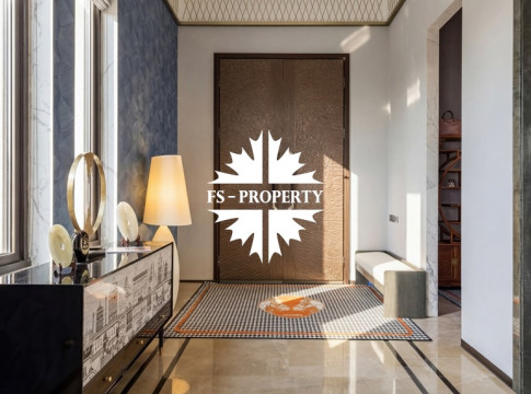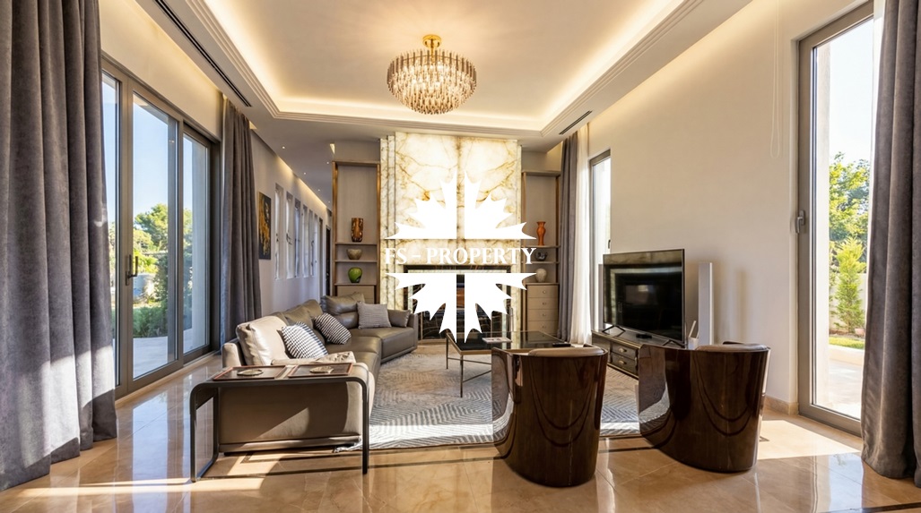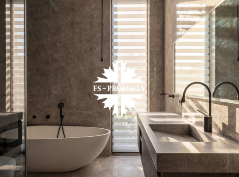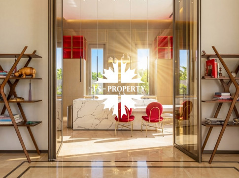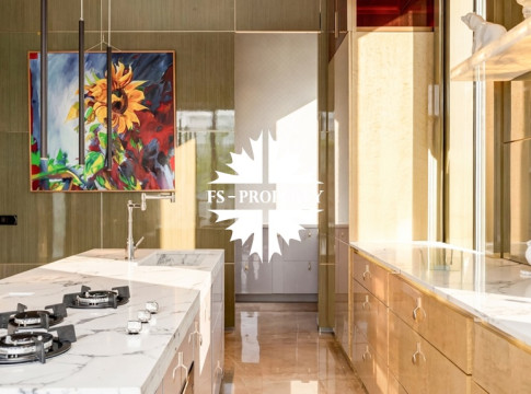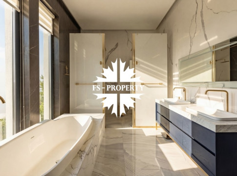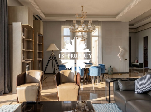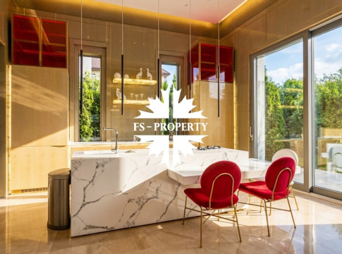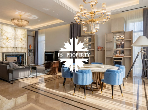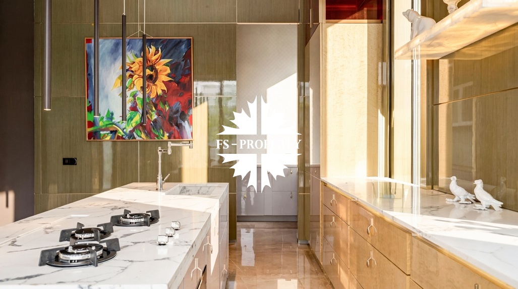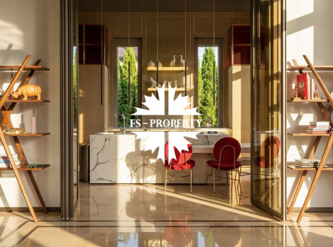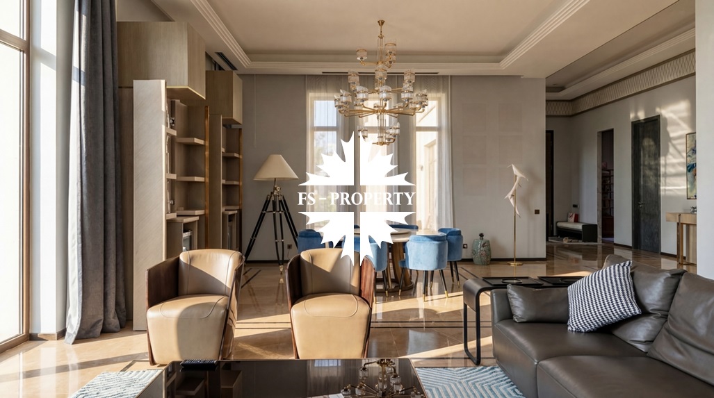 Центром притяжения становится уютная гостиная с уникальным камином, отделанным подсвеченным ониксом. Пространство органично включает современную кухню с собственной кладовой и выходом на террасу, кабинет для уединённой работы, три спальни и три санузла. Практичность обеспечена просторной гардеробной при входе, постирочной и гаражом на три автомобиля