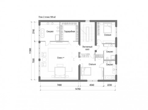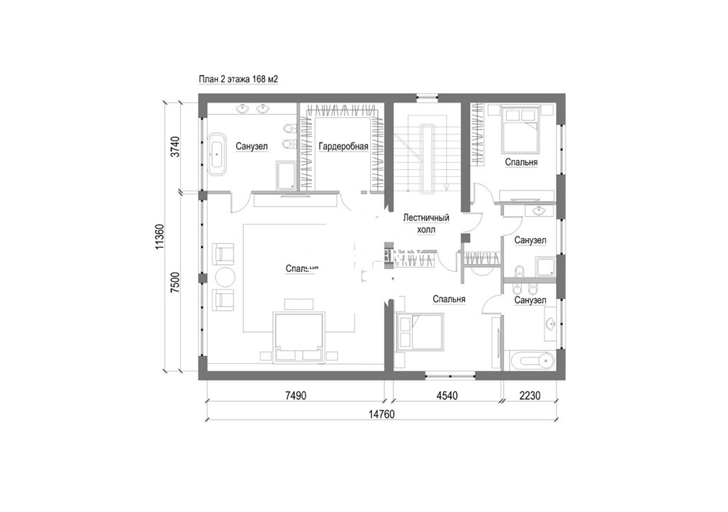 На втором этаже: холл, 3 спальни со своими с/у и гардеробными.