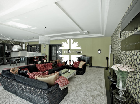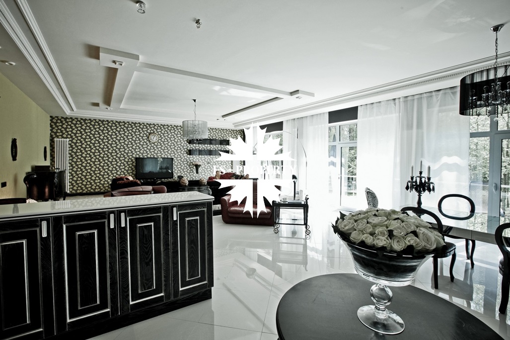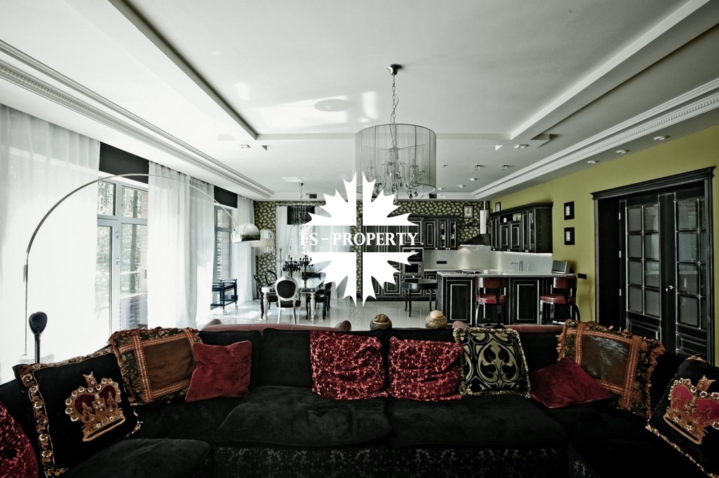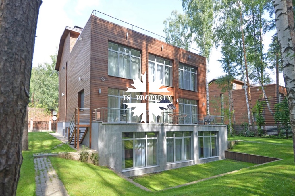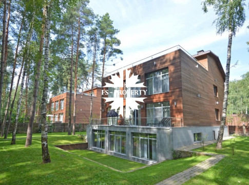 Интерьер дома выдержан в стиле Ар-деко. Есть вся необходимая мебель и техника. Монолитно-кирпичный дом с внешней отделкой из лиственницы имеет 4 функциональных уровня.