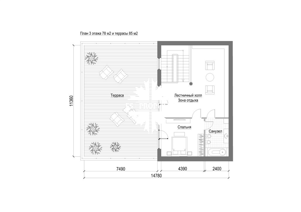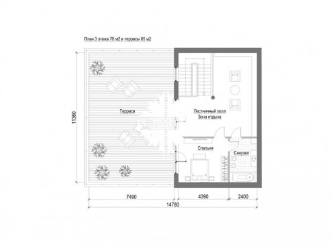 На третьем этаже: зона отдыха, спальня, с/у, терраса.