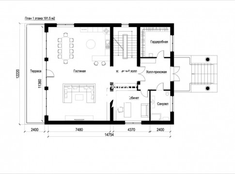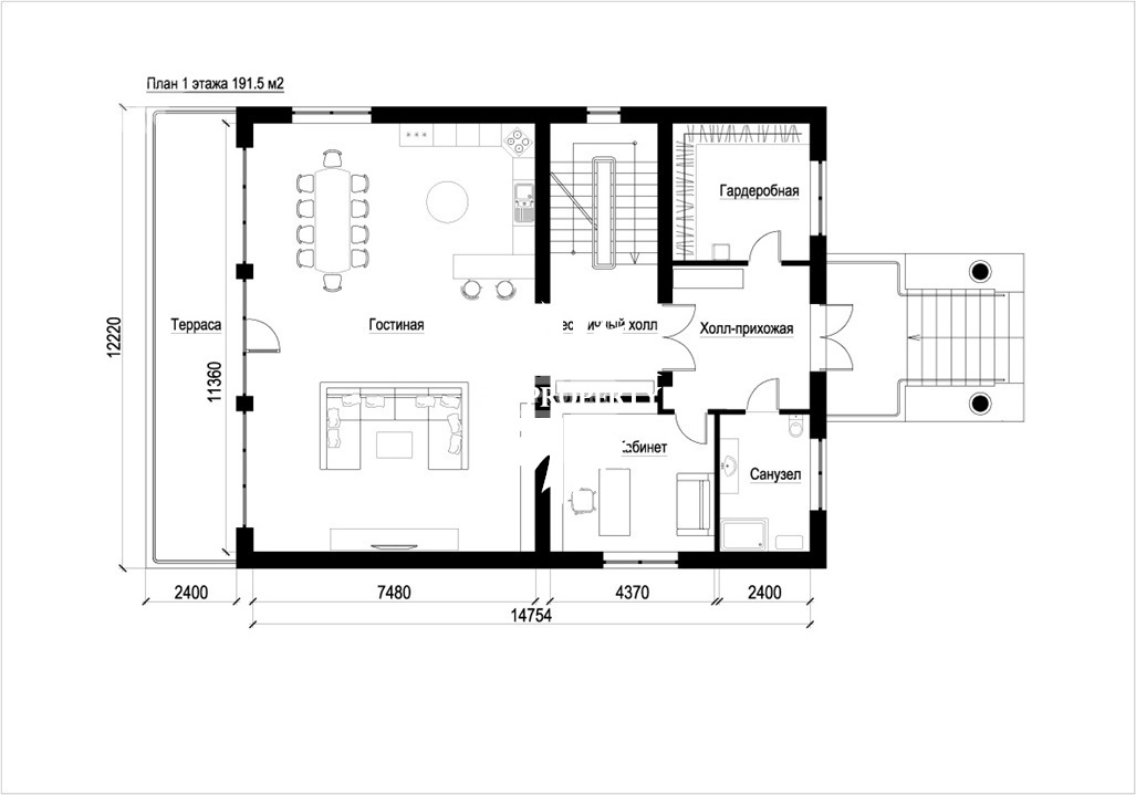 На первом этаже расположены: прихожая, гардеробная, холл, гостиная, кухня-столовая, кабинет, с/у, терраса.