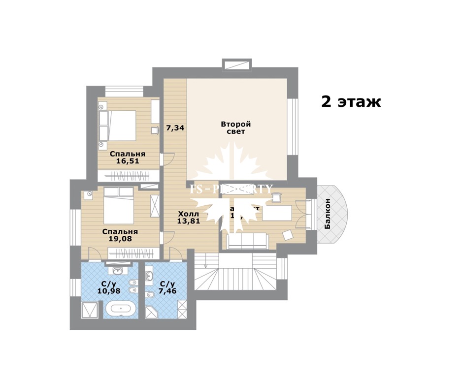 2 этаж: мастер-спальня с ванной комнатой, детская спальня, кабинет с выходом на балкон, санузел, холл.
