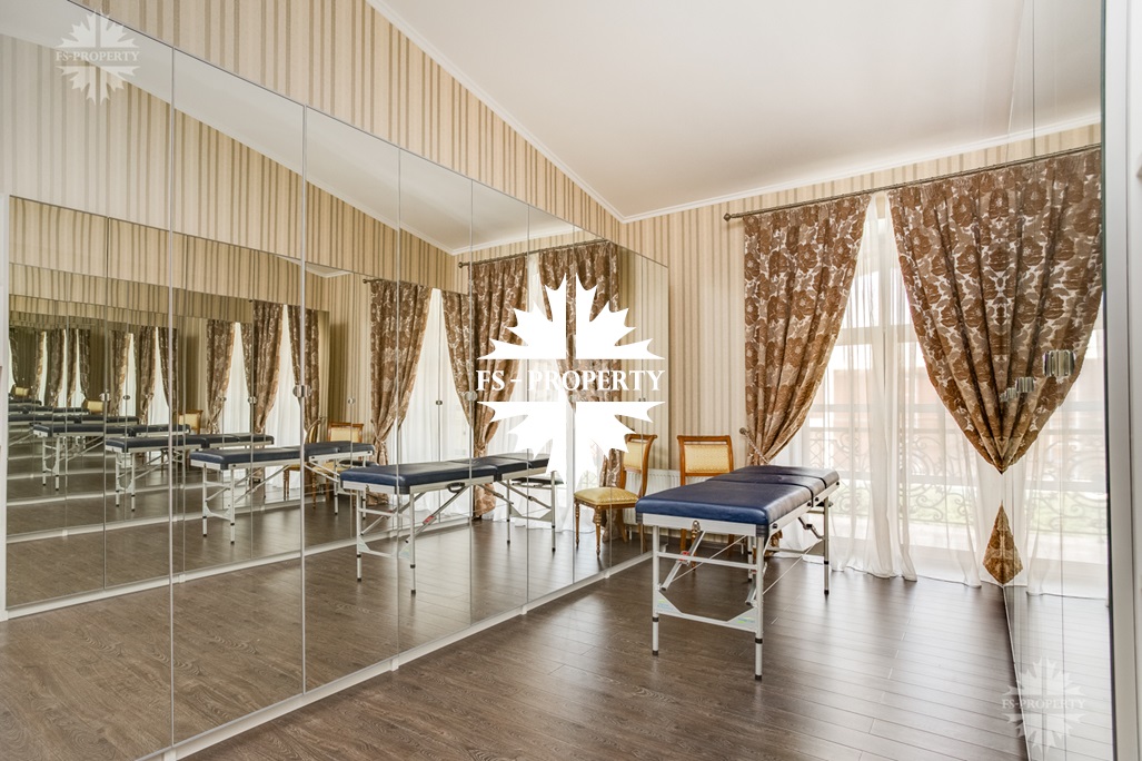 Первый этаж: гараж на 3 машины, санузел, гардеробная, гостиная со вторым светом и каминной зоной, кухня-столовая, рабочая кухня с кладовой, кабинет. СПА-зона: комната отдыха, бассейн 15х5, сауна, хамам, санузел, душ.