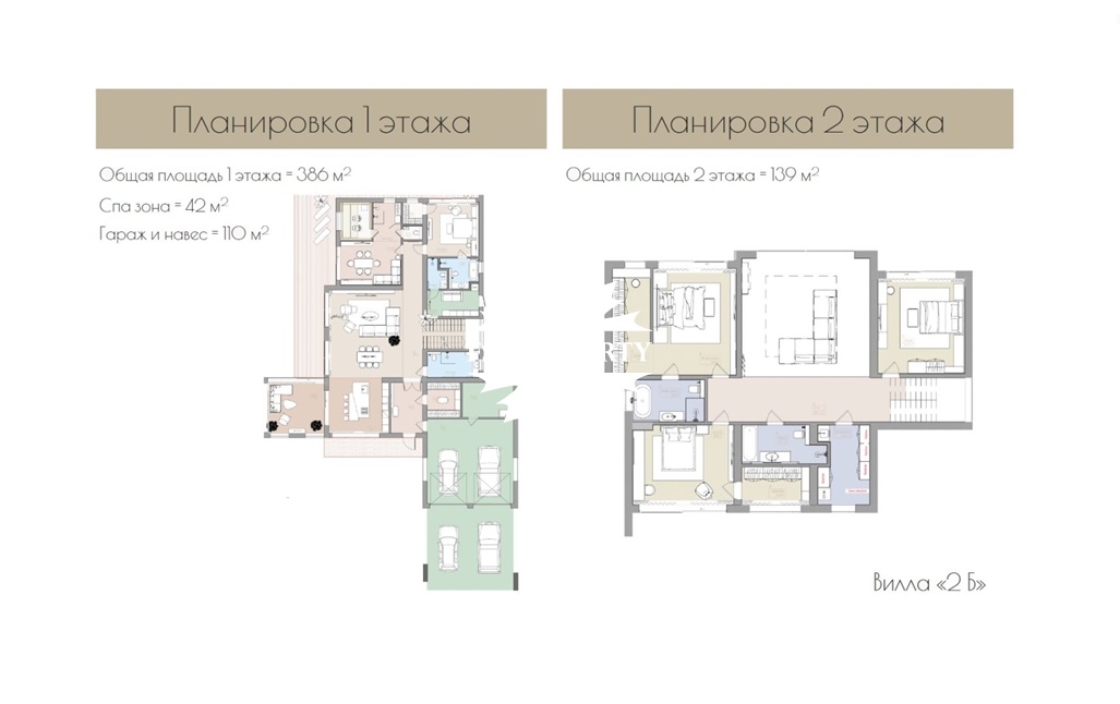 Планировкой предусмотрены 3 спальни, гостиная, кухня-столовая, блок для персонала, СПА-зона с бассейном.